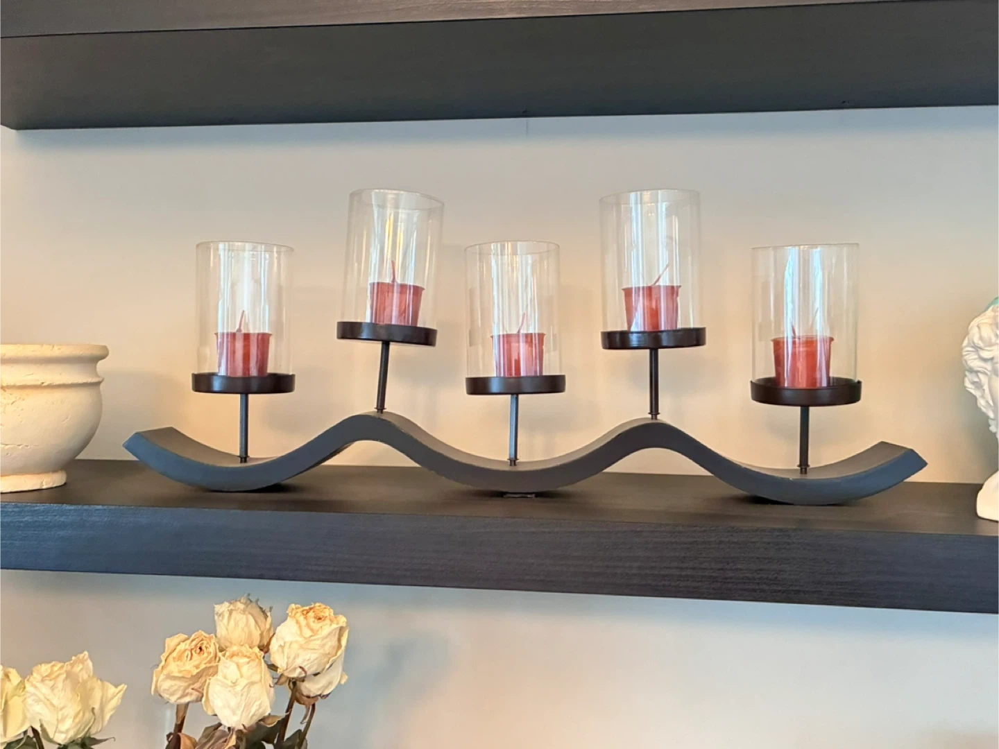 This candelabra holds five pillar candles, each protected by a clear glass shade. It's designed with a unique wavy base that adds a modern touch to any decor. Metal and glass construction.