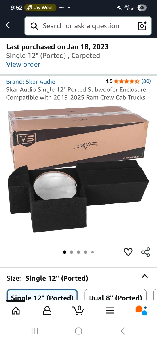 Selling a Skar Audio single 12" ported subwoofer enclosure. It's compatible with 2019-2025 Ram Crew Cab Trucks. It is carpeted and in good condition!