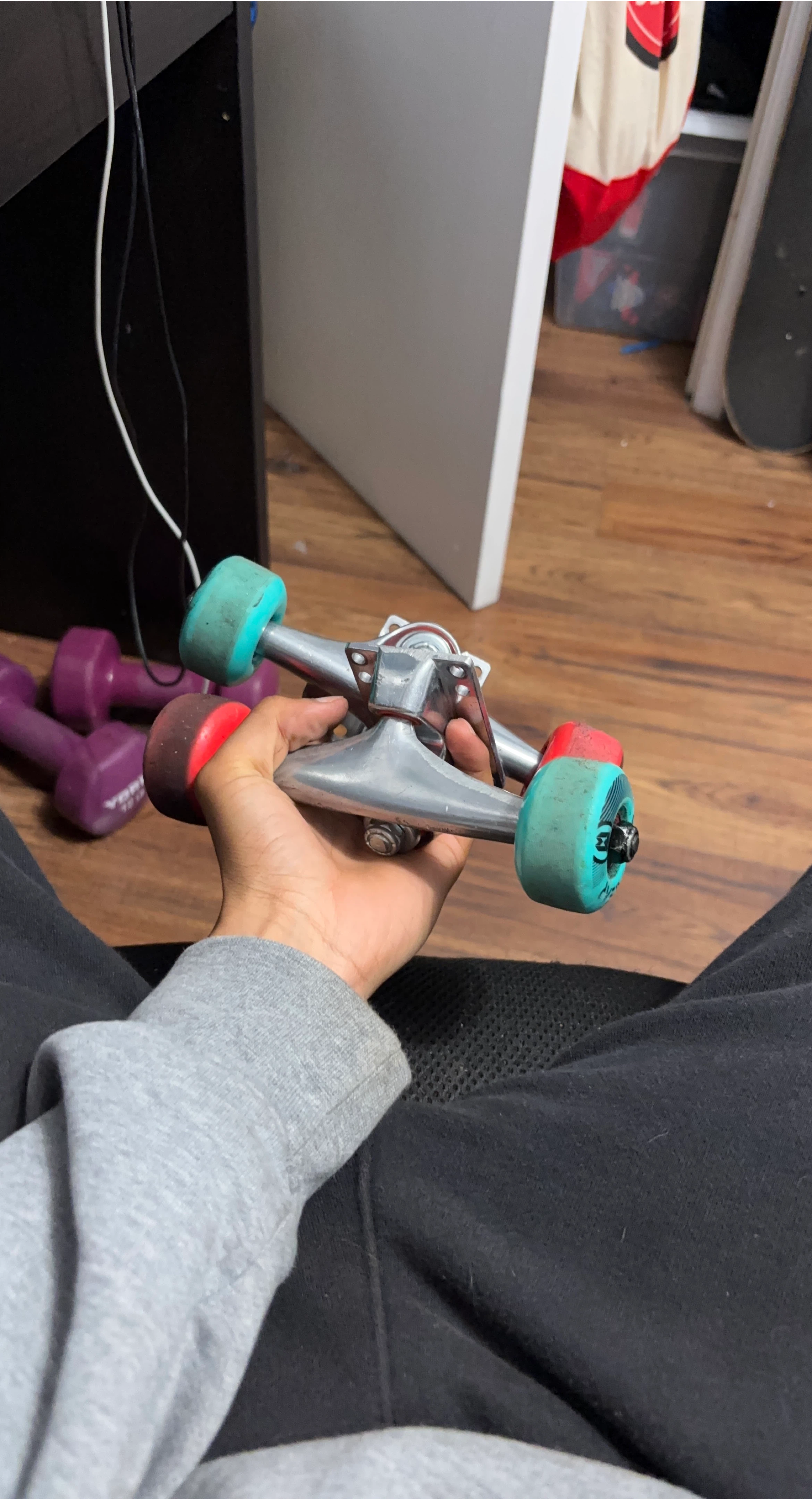 16Selling a set of skateboard trucks and wheels. The wheels have a cool colour combo of red and turquoise!
