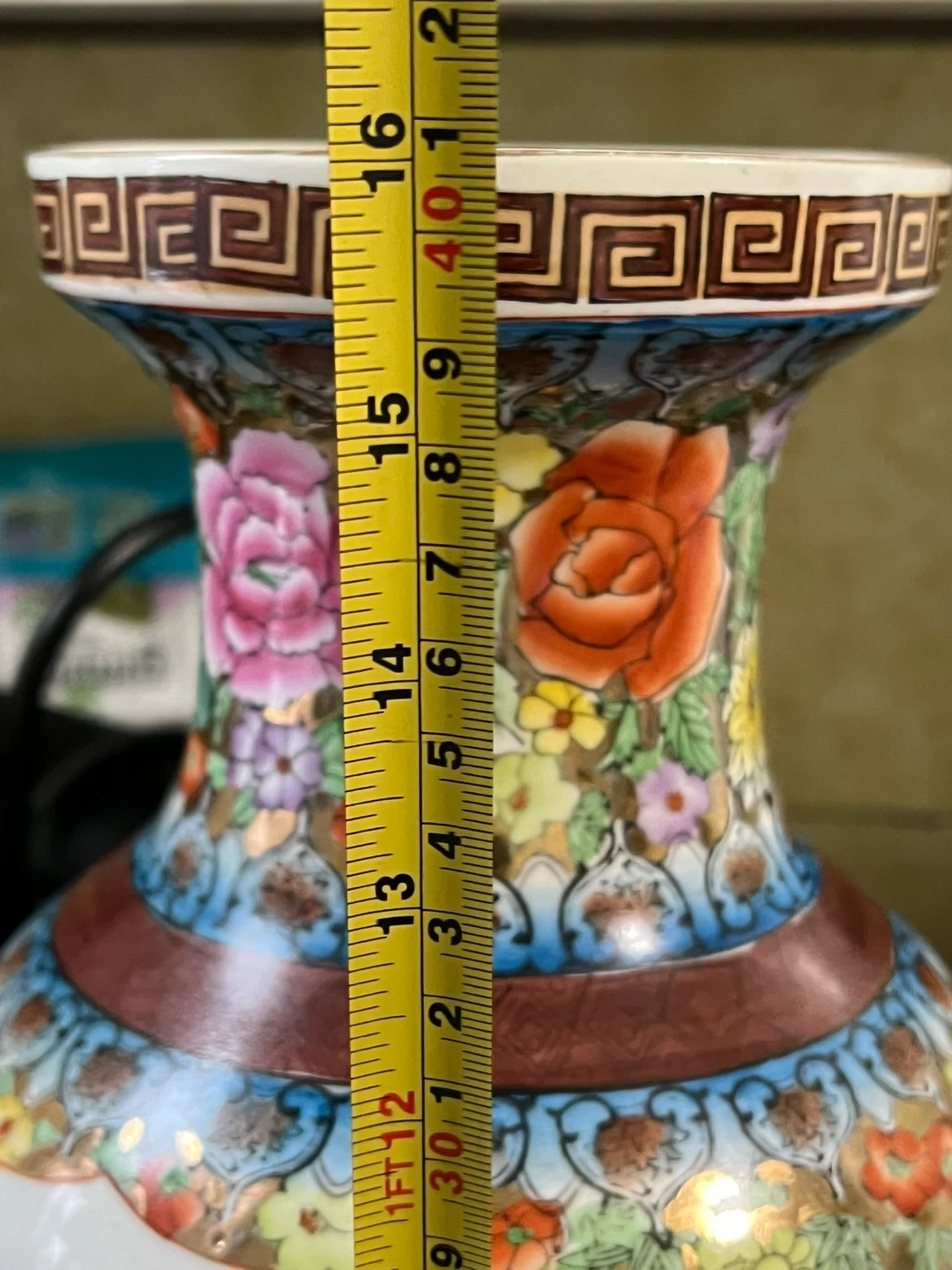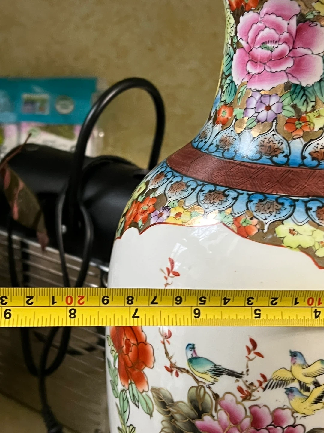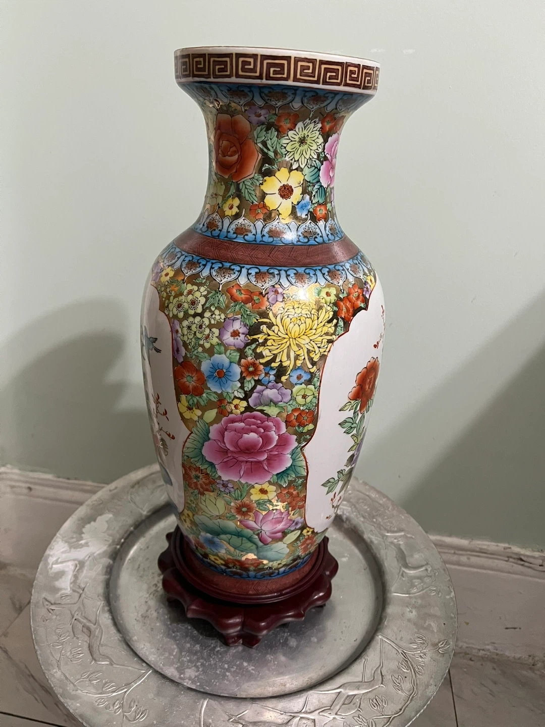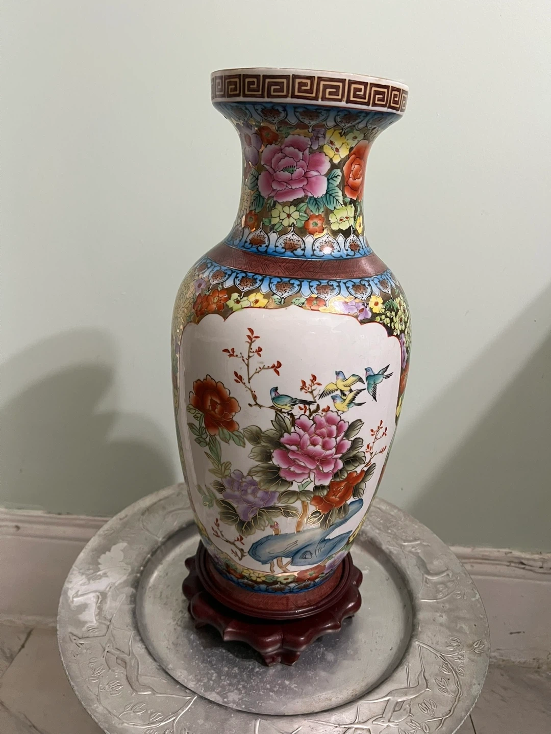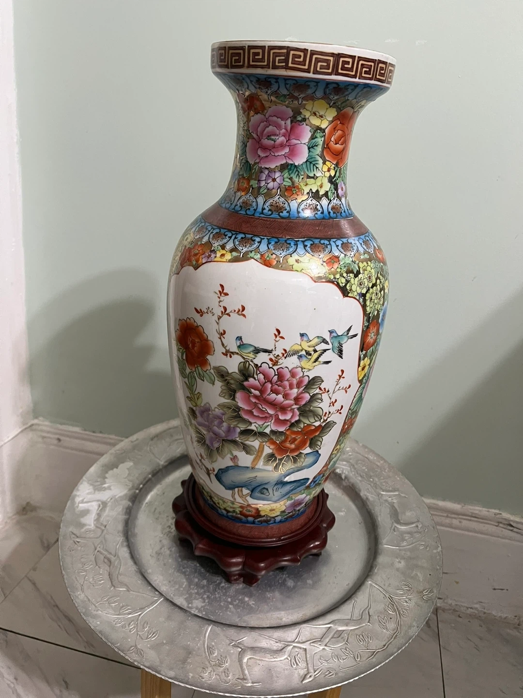 This is a beautiful ceramic vase with a vibrant floral and bird design. It features a colorful glaze and comes with a wooden base for display. Its decorative pattern makes it a striking piece for any room.
