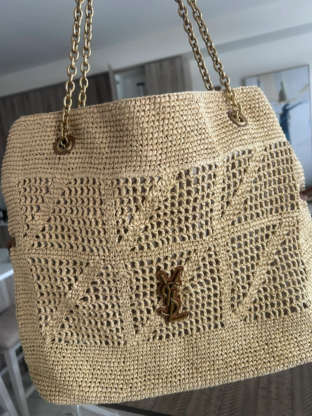 This Saint Laurent tote bag is made from woven raffia with leather trim and gold-tone hardware. It features a secure closure and is perfect for everyday use.