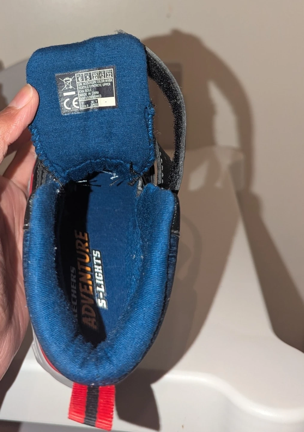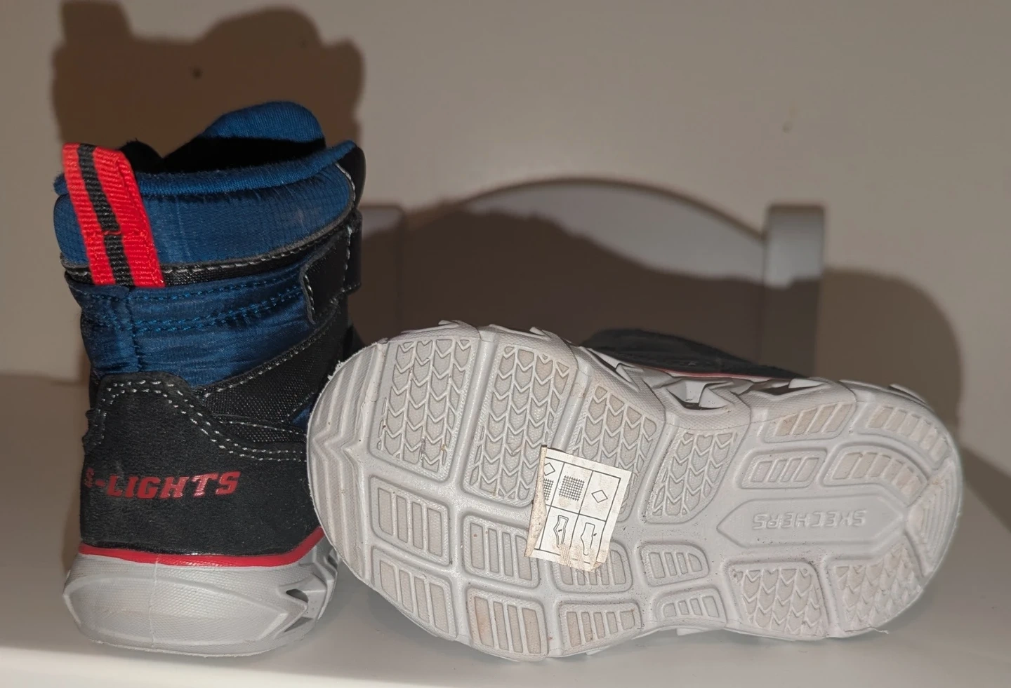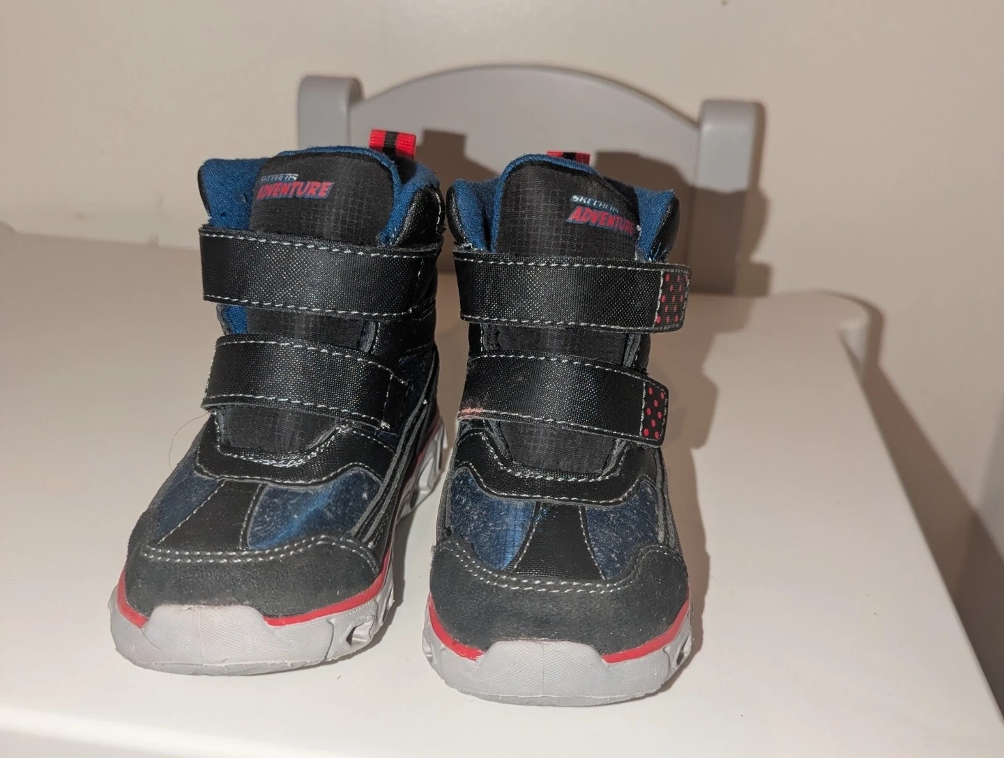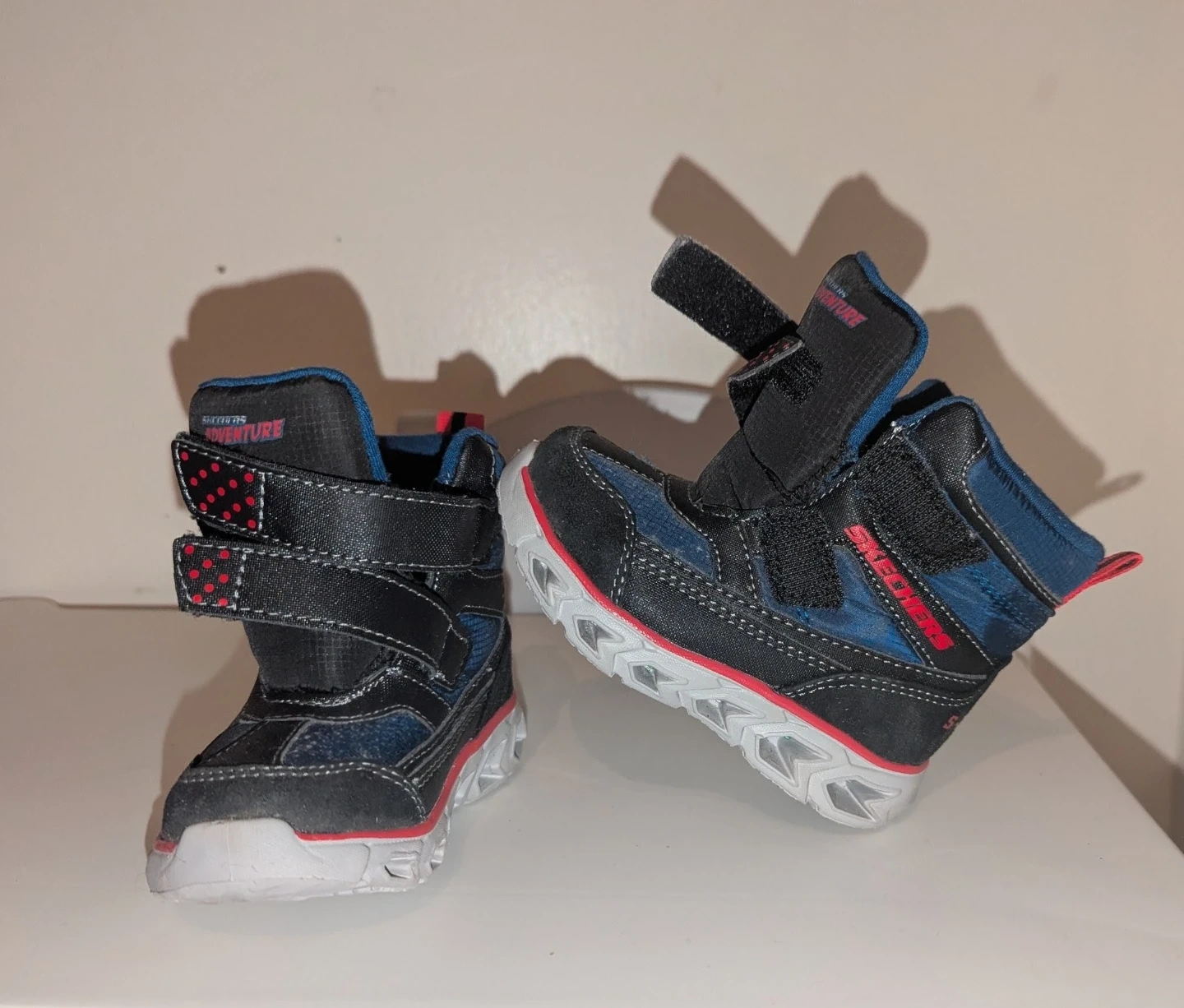 89Selling a pair of Skechers Adventure S-Lights boots in a size 6! They're in good condition and ready for new adventures. They feature a black and blue design with red accents and cool light-up soles