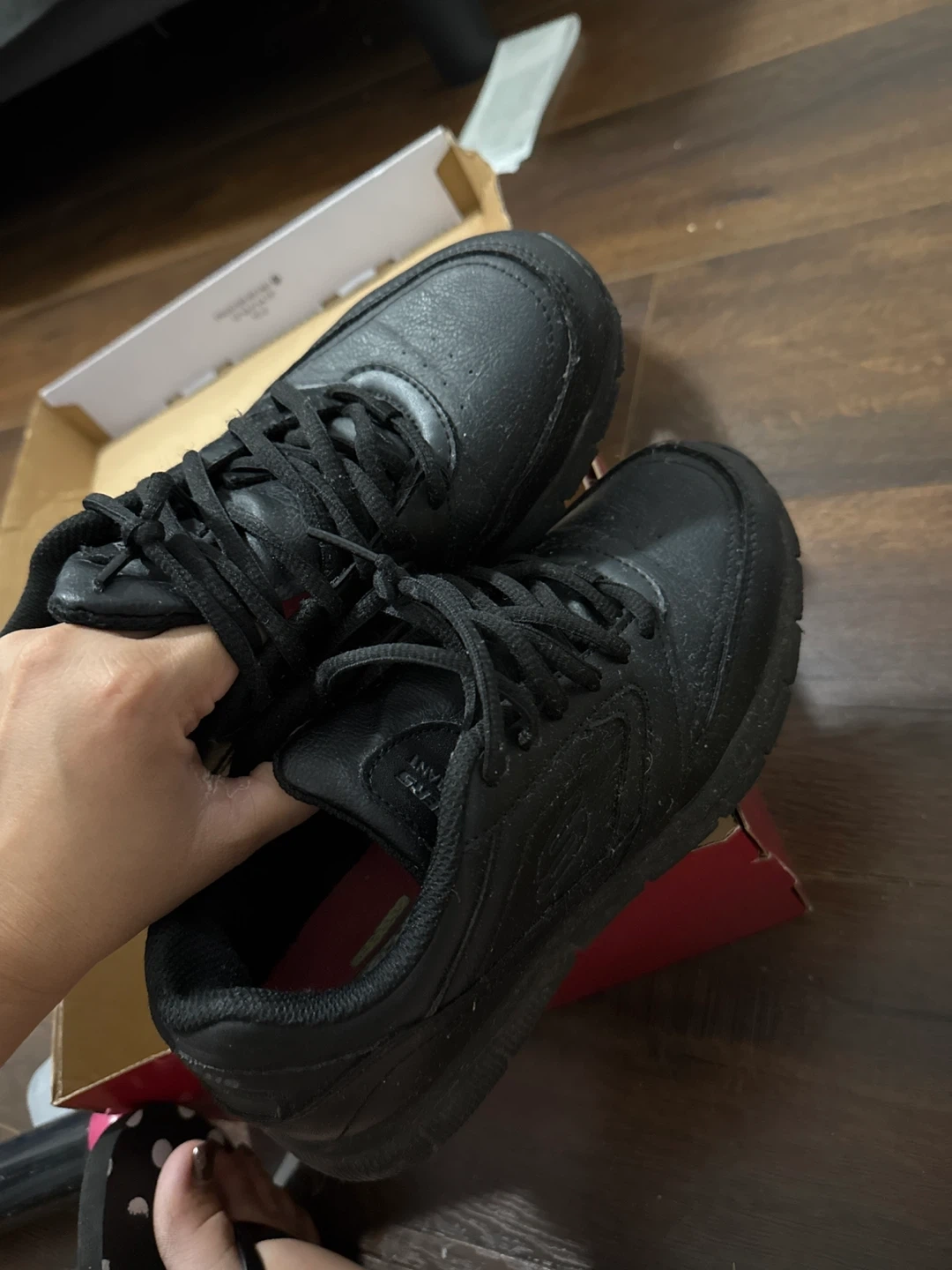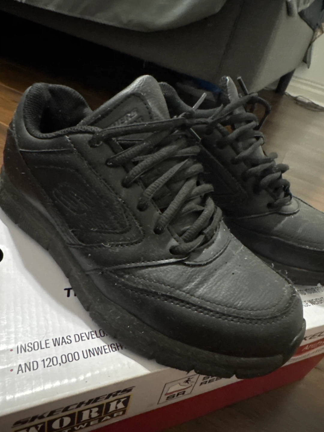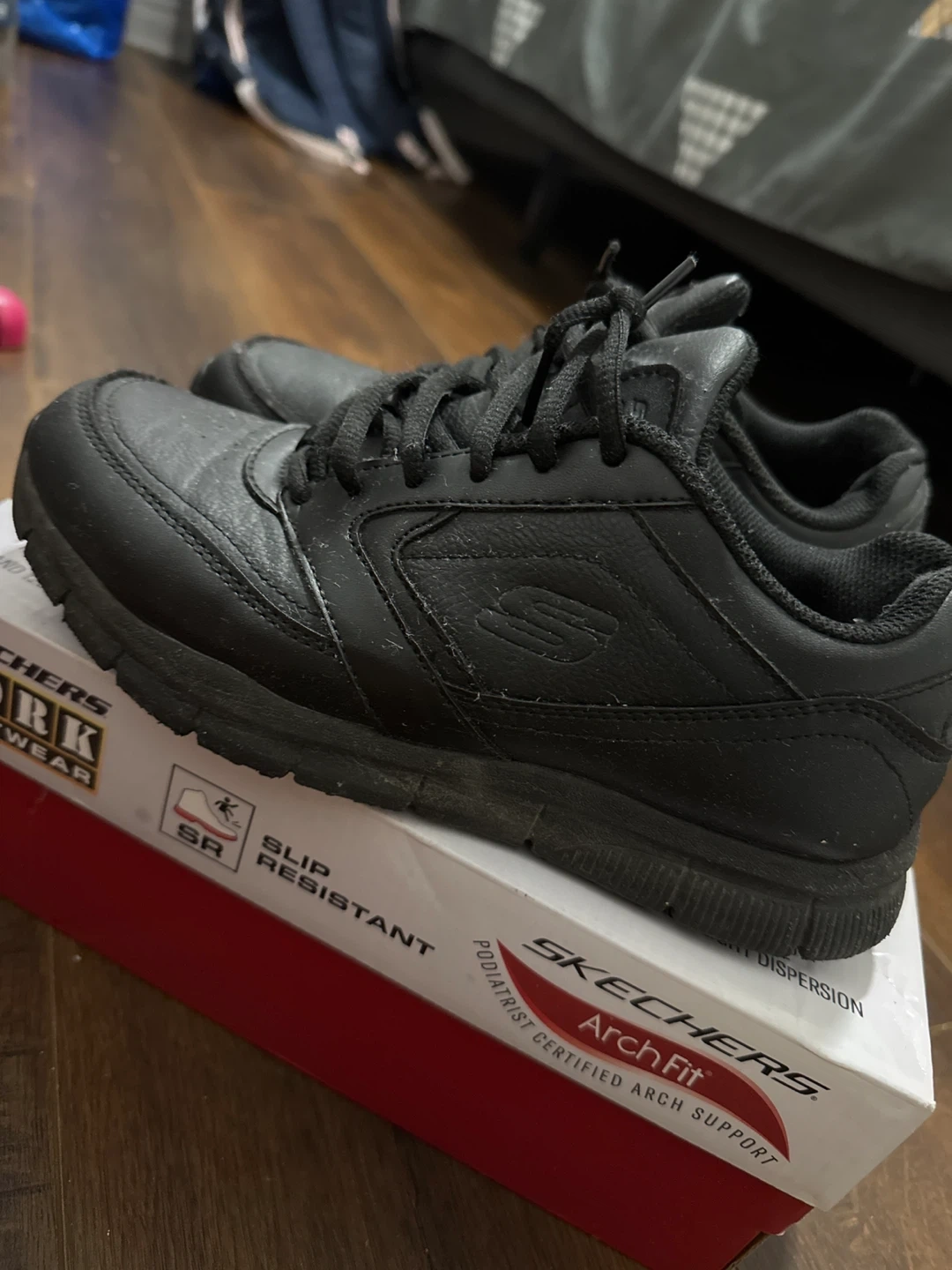 Selling a pair of Skechers Arch Fit work shoes! They are slip-resistant, great for on the job. The shoes come with the original box.
