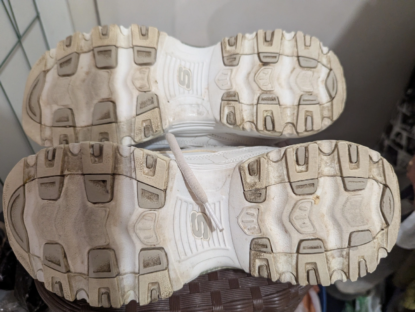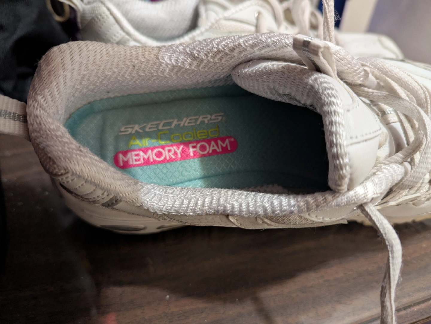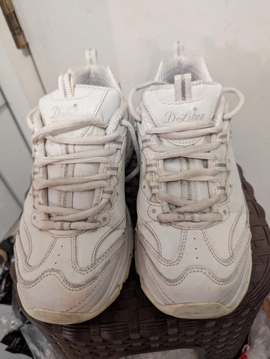 107Selling a pair of Skechers D'Lites sneakers. They are white and feature Skechers Air-Cooled Memory Foam insoles. They show some signs of wear on the soles, but are otherwise in good condition!