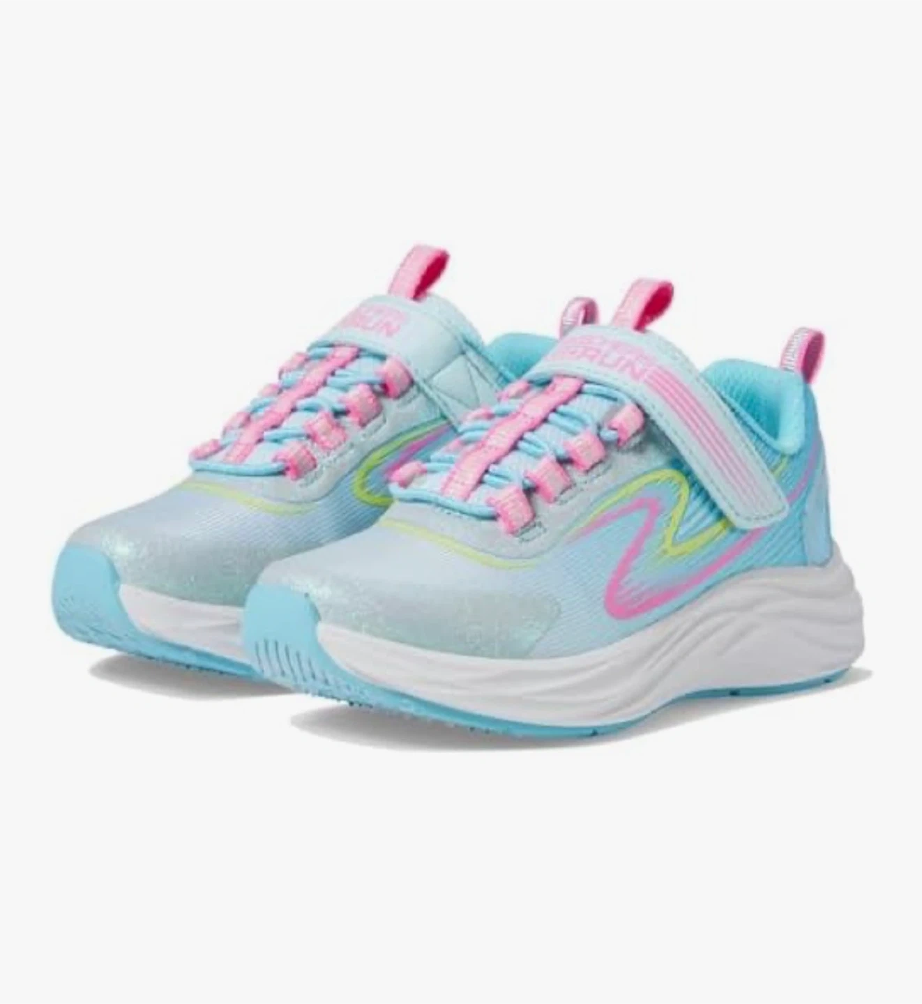 US 3,5 These Skechers Go Run Sparkle Runner shoes are perfect for your little one! They feature a light blue colour with pink and yellow accents. The shoes are size 11 and have a convenient hook and loop closure with bungee laces. The insole is air-cooled and Goga Mat for extra comfort. Plus, they're machine washable for easy cleaning!