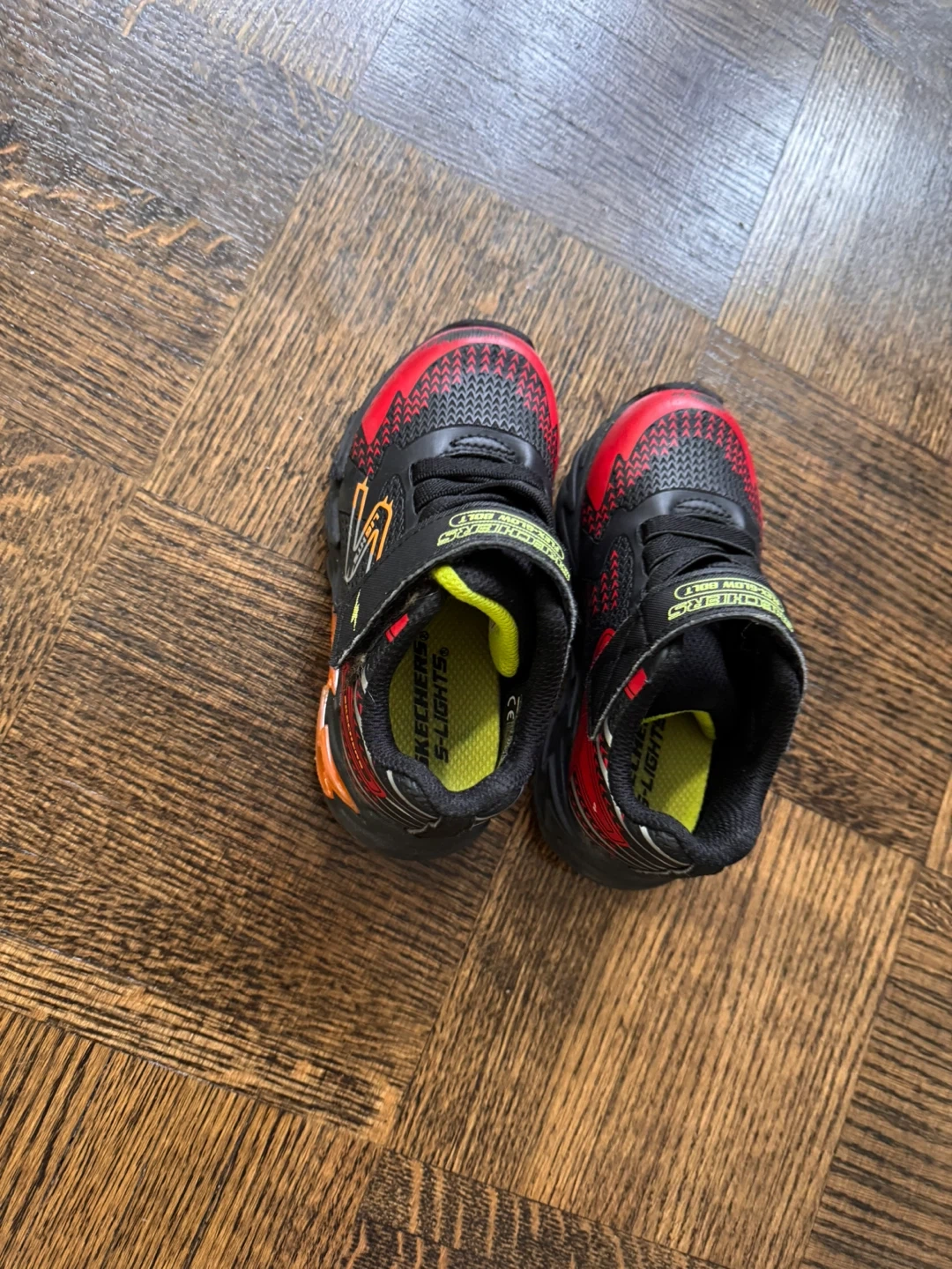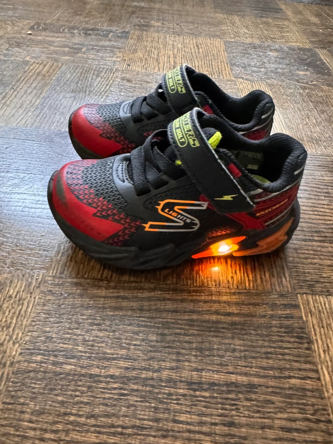 These Skechers S-Lights are perfect for your little one! They are size 8 and feature fun lights in the soles. The shoes are black and red with a velcro strap for easy on and off. They're in great shape and ready for a new adventure!