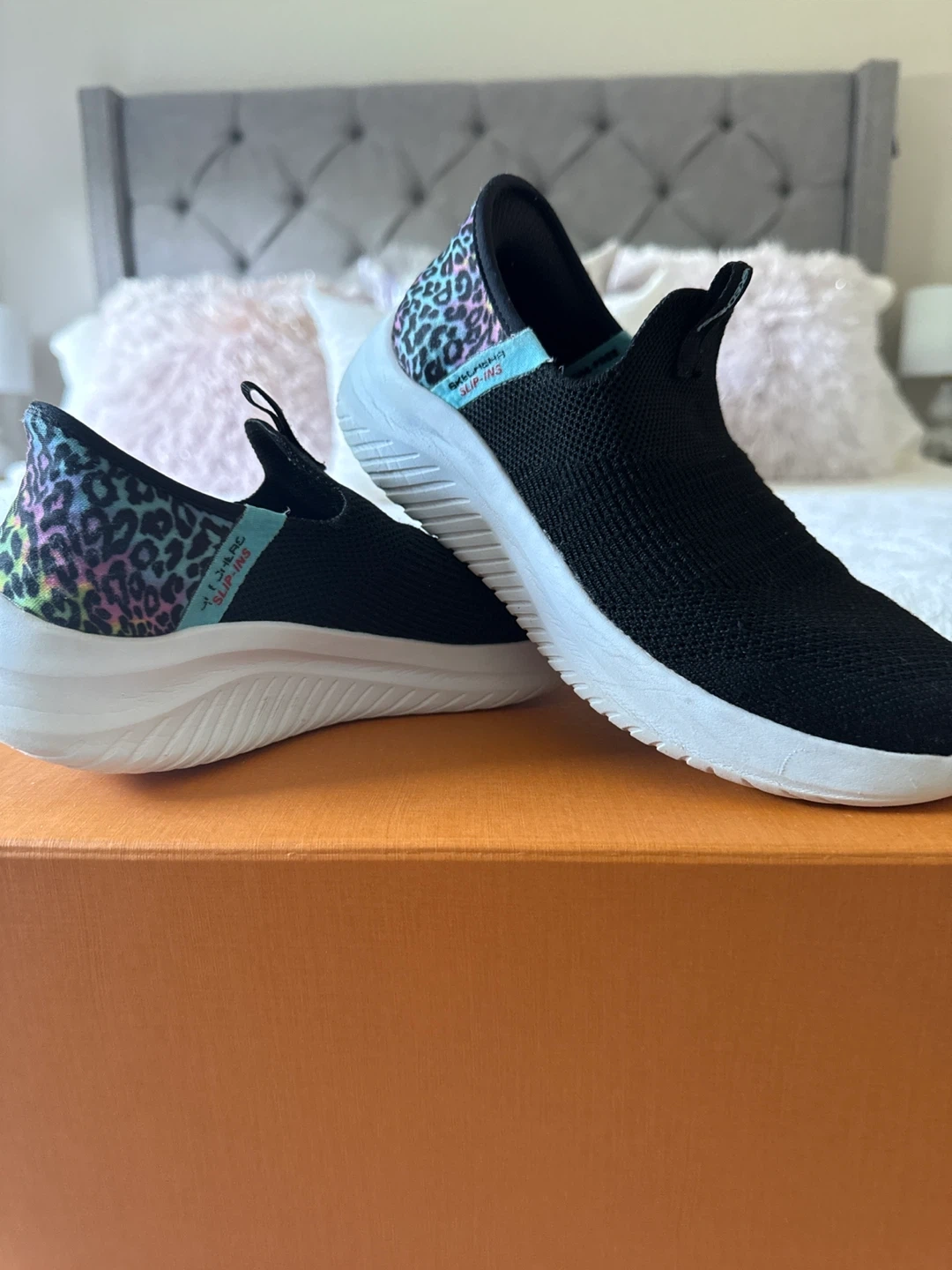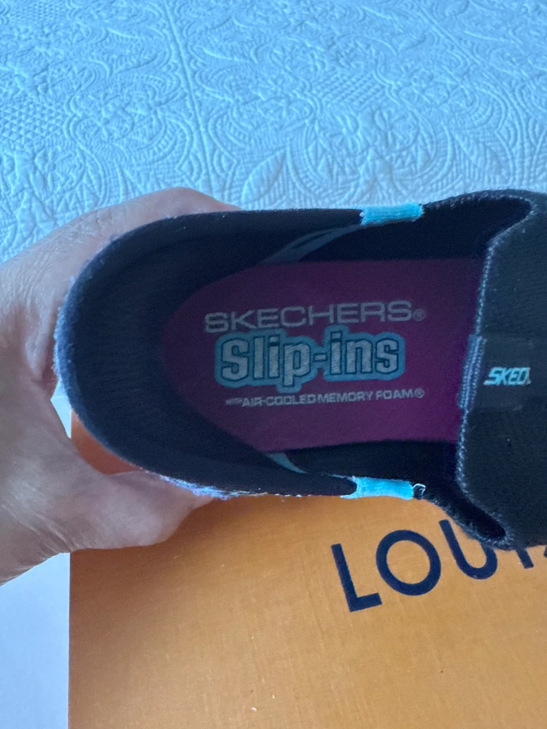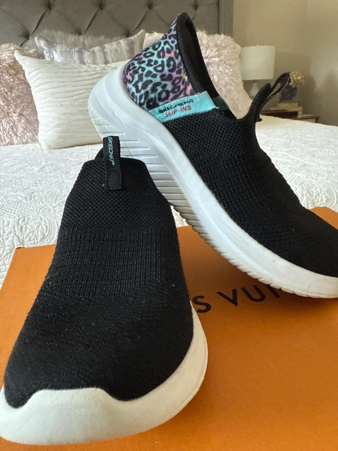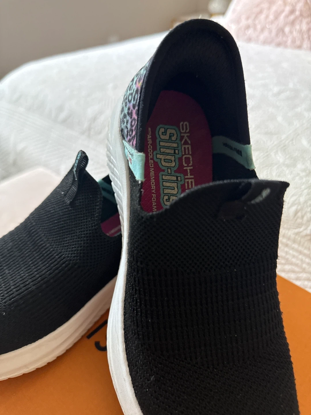 Selling a pair of Skechers Slip-ins in black knit! These are a youth size 3 and feature air-cooled memory foam for extra comfort. The colour is BKMT. Used as indoor shoes. They're in excellent shape, and ready for a new owner
