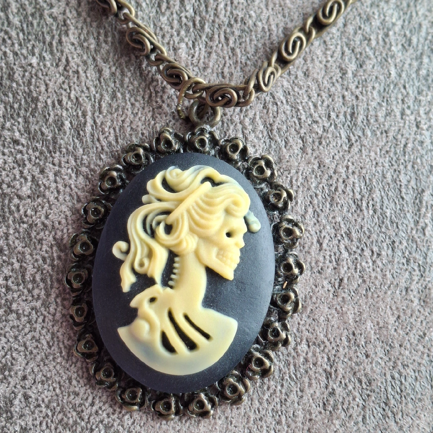 Selling a cameo pendant necklace with a skeleton design. The pendant has an oval shape with a dark background and a skeleton figure in a lighter colour. The chain has a vintage-style bronze colour. It's ready to add a unique touch to your style!