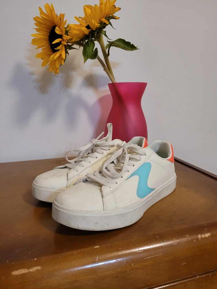 76Cute white sneakers with a blue wave design and orange heel accent! They're in good condition and ready for a new home. Perfect for everyday wear or adding a pop of colour to your outfit. Great for walking or casual sports use.