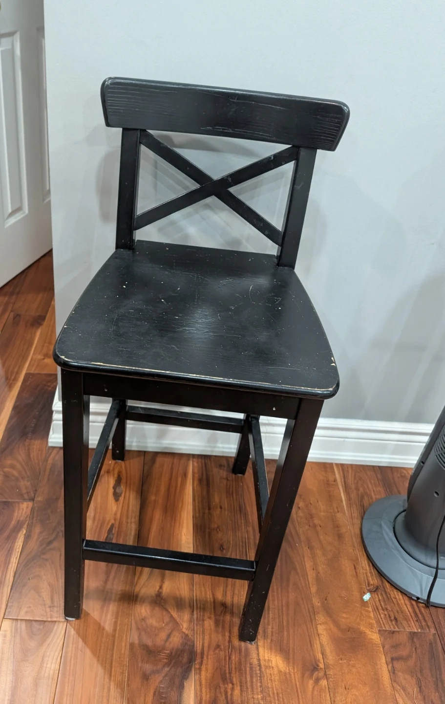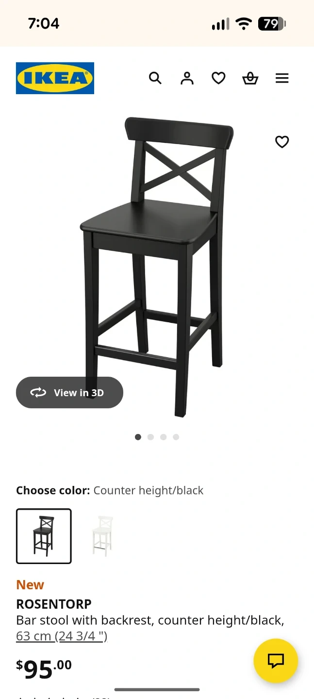 This is an IKEA ROSENTORP bar stool with a backrest in black. It's counter height. The seat height is 63 cm (24 3/4 "). This stool is great for a kitchen counter or bar area.