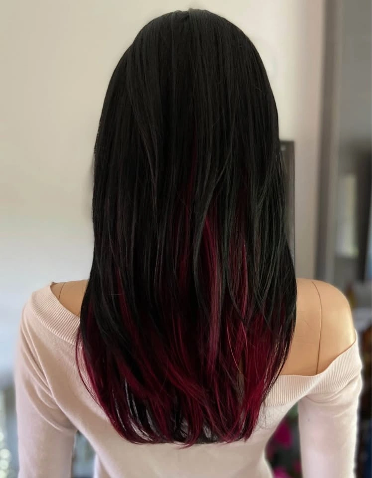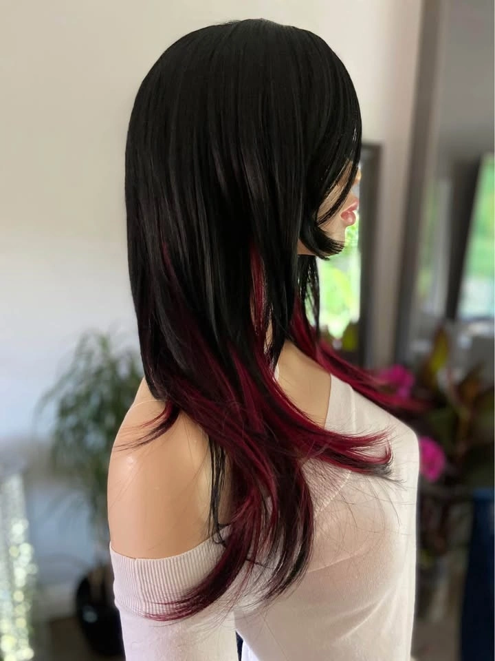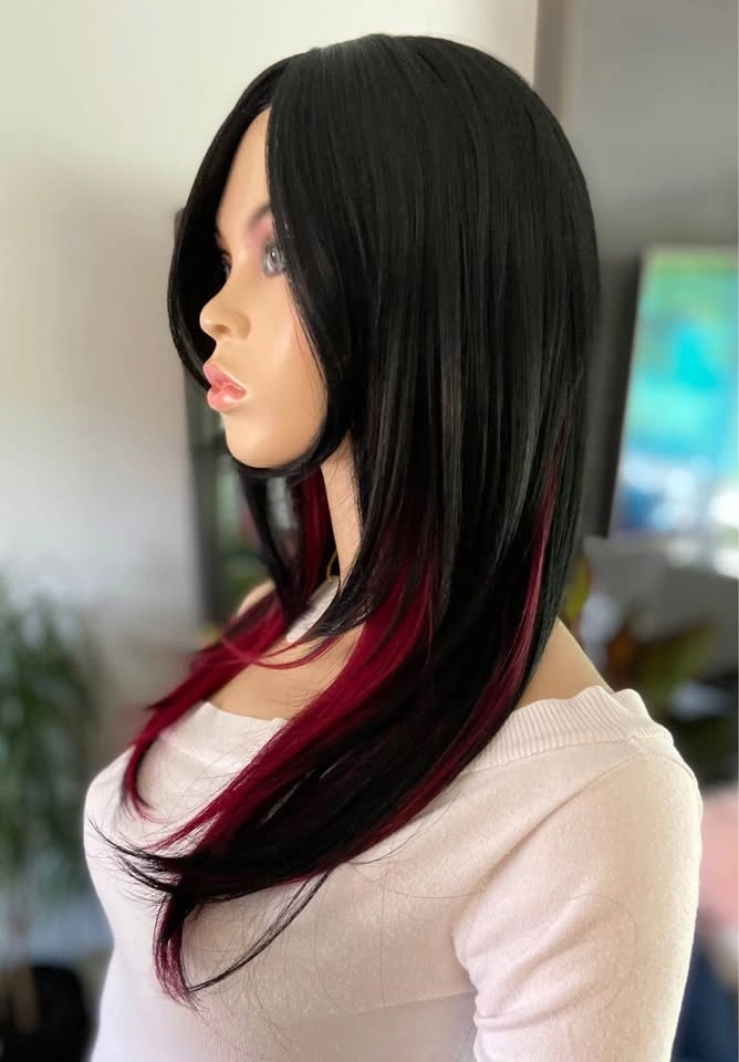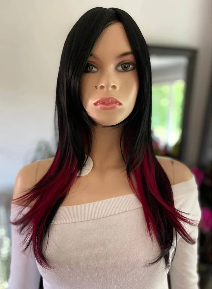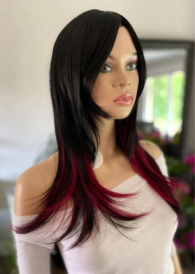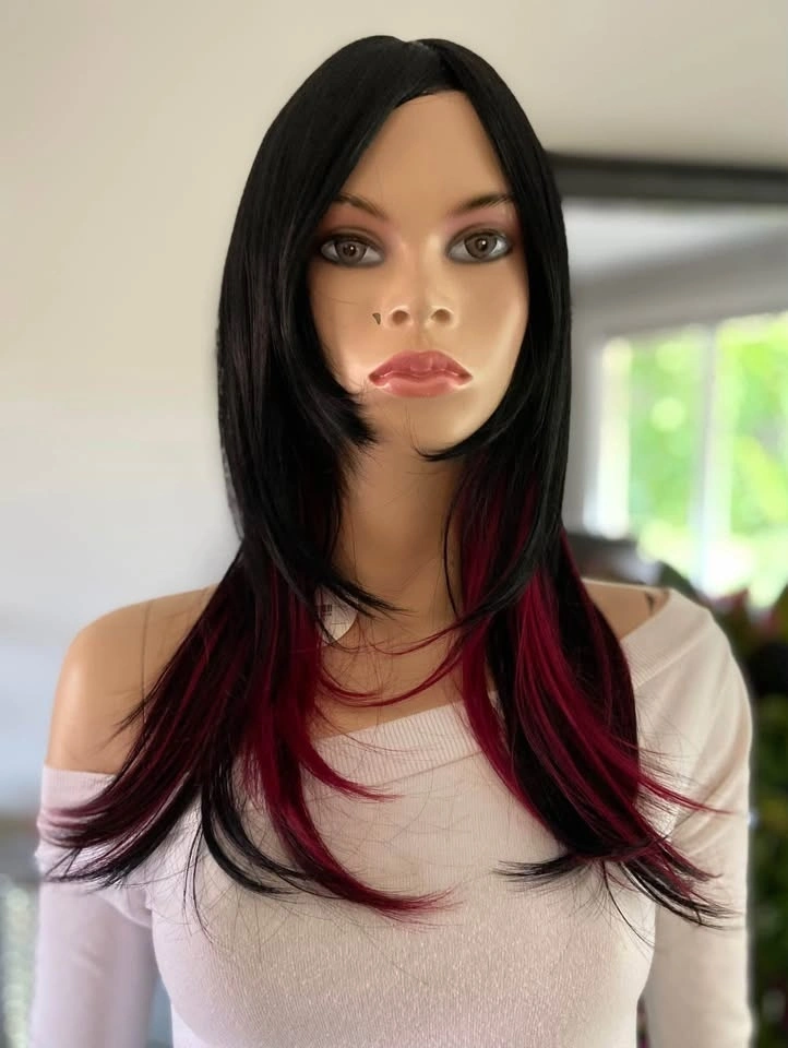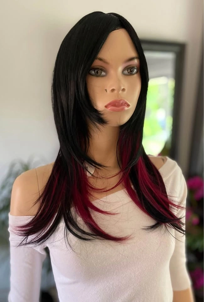NWT: 18” Long Layered Black & Burgundy Red Wine Synthetic Cosplay Wig with Long Bangs (2284)