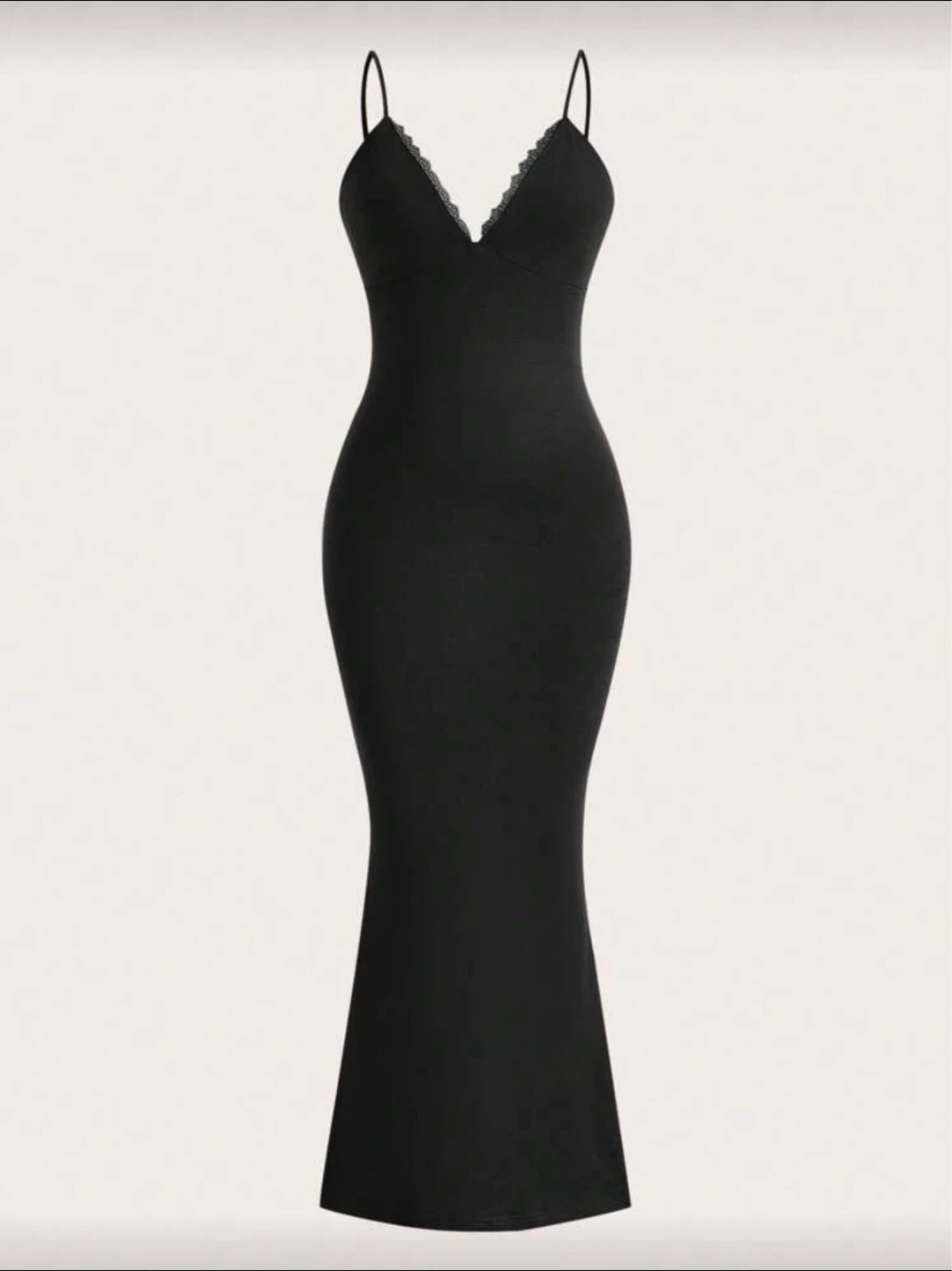 This elegant black maxi dress features delicate lace trim along the V-neckline and slender spaghetti straps. The material is soft and stretchy for comfort. Size S