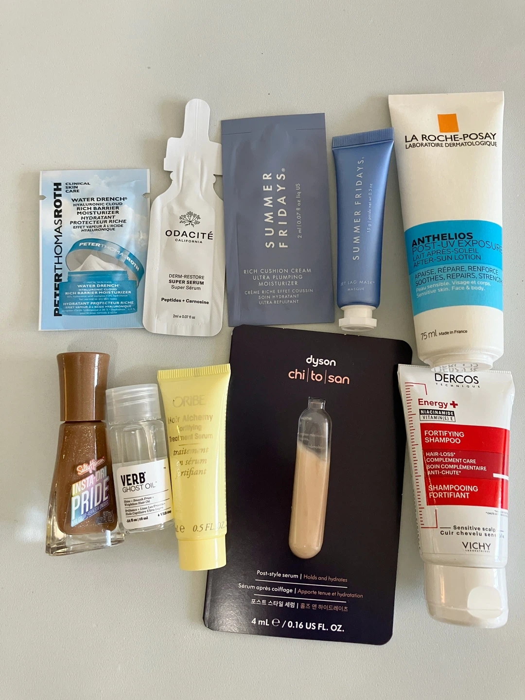 139This set includes Peter Thomas Roth Water Drench moisturizer, Odacité Derm-Restore Super Serum, Summer Fridays Rich Cushion Cream and Jet Lag Mask, La Roche-Posay Anthelios After-Sun Lotion, Sally Hansen Insta-Dri nail polish, Verb Ghost Oil, Oribe Hair Alchemy Fortifying Treatment Serum, Dyson Chi to San post-style serum, and Vichy Dercos Energy+ Fortifying Shampoo.