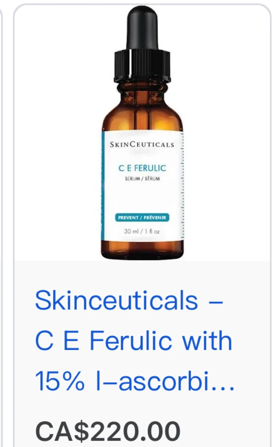 44Selling a SkinCeuticals C E Ferulic serum. It's a preventative serum in a 30ml/1 fl oz bottle. Originally bought for CA$220.00