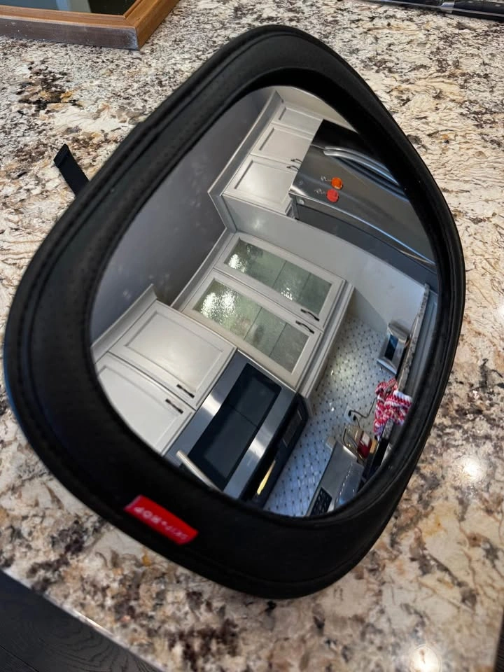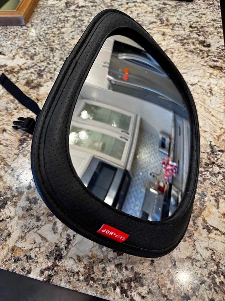 10This smart-looking baby car mirror proves a wide angle view of little one. The fashionable faux leather trim coordinates with any car interior. Features Padded frame with fashionable faux leather trim Multi-angle pivot for easy adjustability Shatterproof mirror Convex wide angle for easy viewing Allows baby to see his or her reflection Fits most vehicle headrests