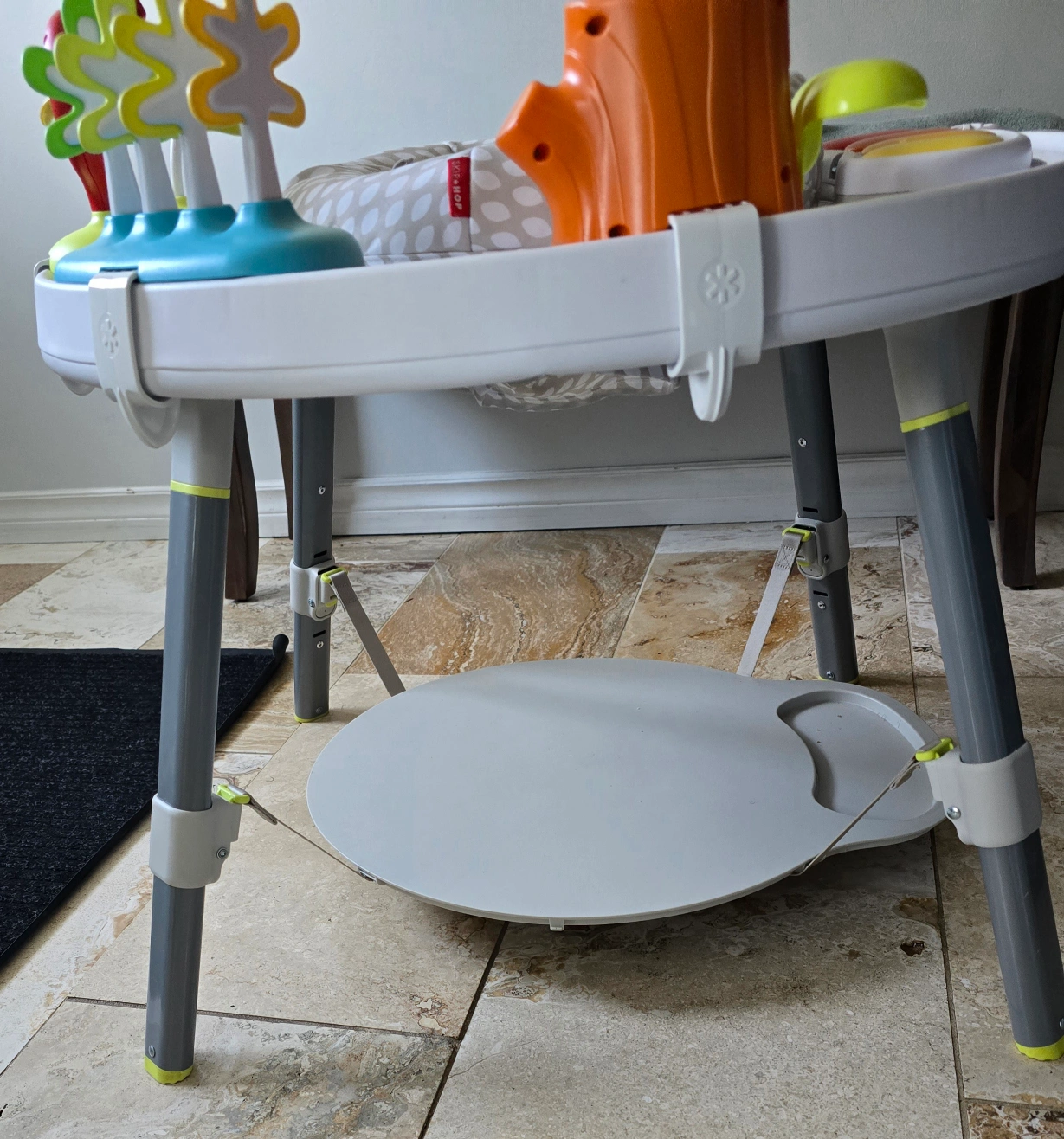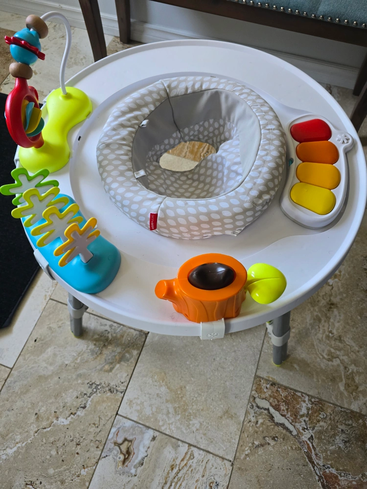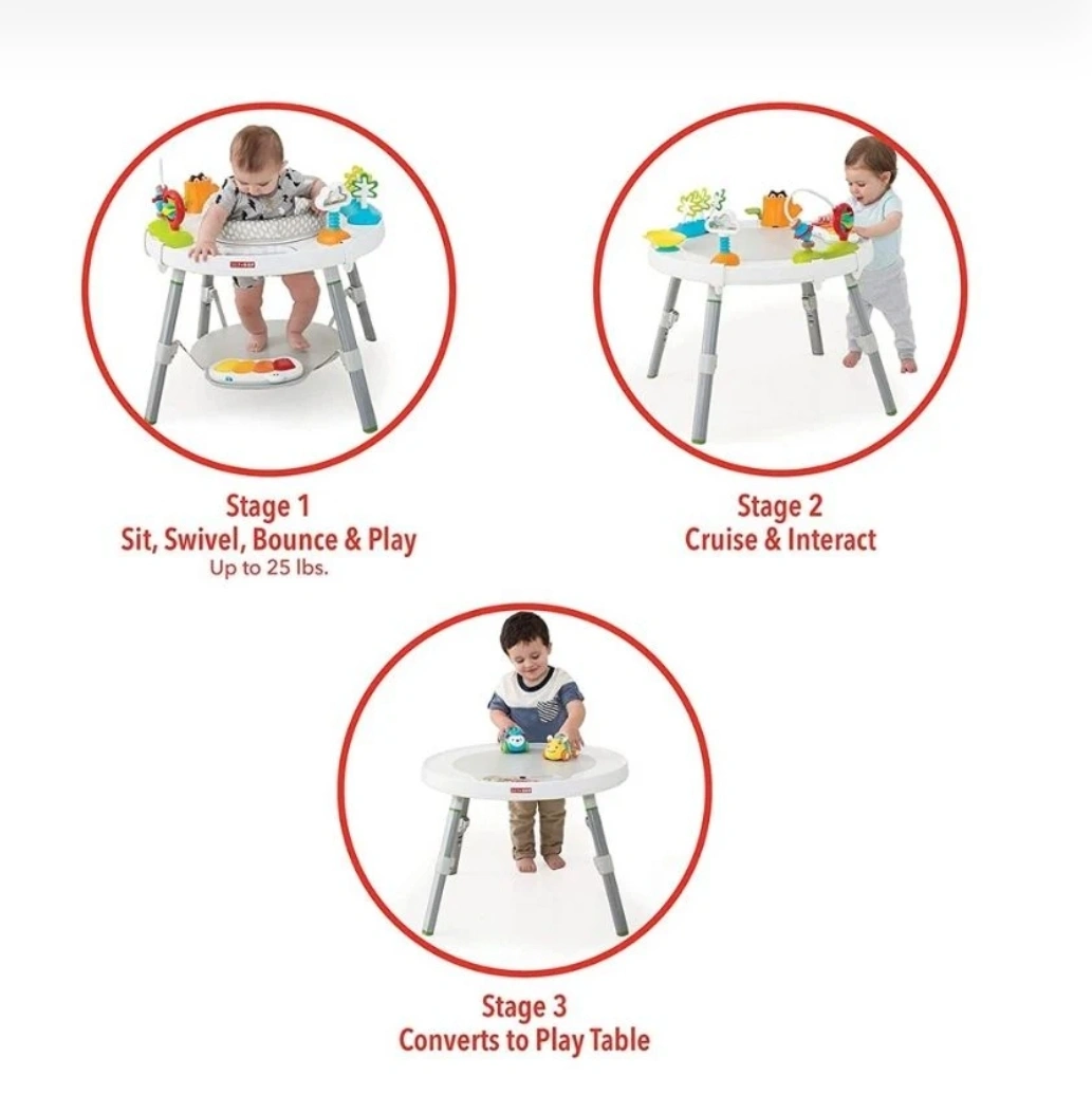 This is a Skip Hop Explore & More Jumpscape Activity Center! It converts to a play table as your little one grows. It supports up to 25 lbs and is perfect for stages 1-3: Sit, Swivel, Bounce & Play, Cruise & Interact, and Converts to Play Table