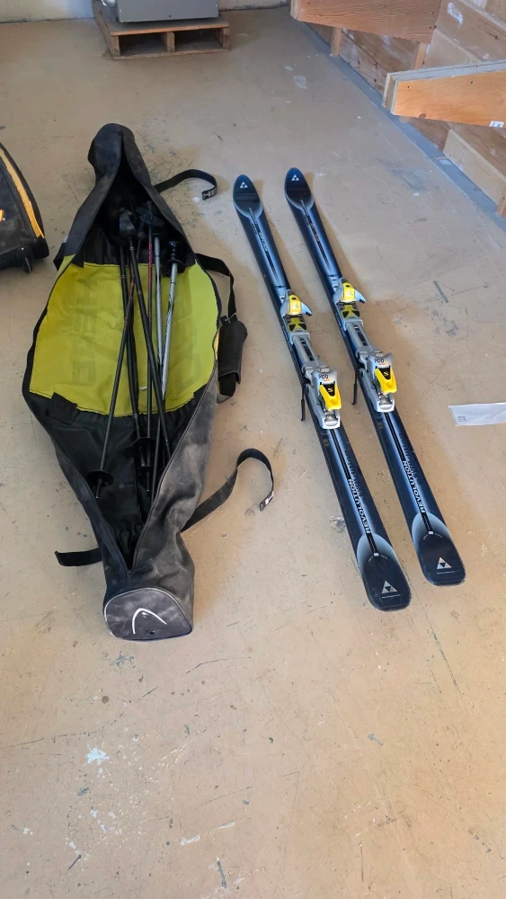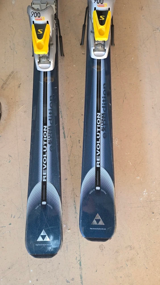 10Great condition. Hardly used at all. Skis Brand: Fischer Revolution, 183cm. Bindings Brand: Solomon 900 Equipe. Also included are two sets of poles.