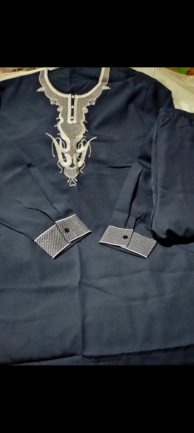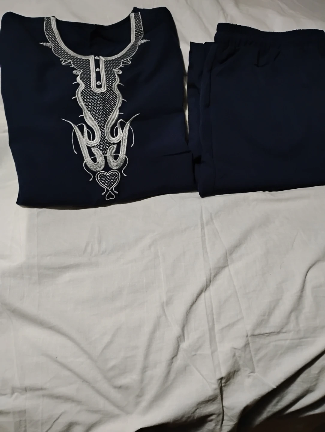 A stylish two-piece set featuring a dark blue embroidered dashiki tunic and matching pants. This outfit has intricate silver embroidery on the neckline and cuffs. It's ideal for cultural events or casual wear.