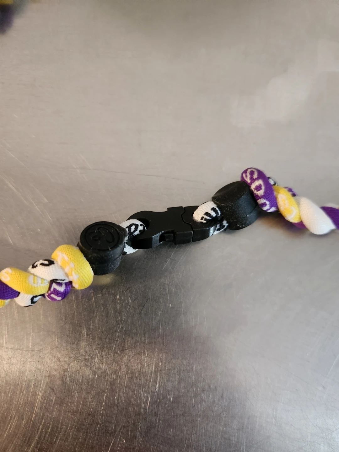 Braided necklace featuring purple, yellow, and white colours. It has a secure black plastic clasp. This necklace is perfect for athletes or anyone looking for a casual accessory.