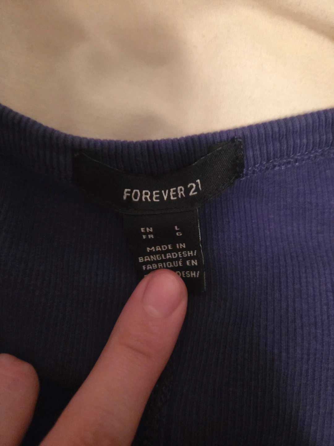 This is a blue long-sleeved top from Forever 21. It's a size large. The material is soft and stretchy.
