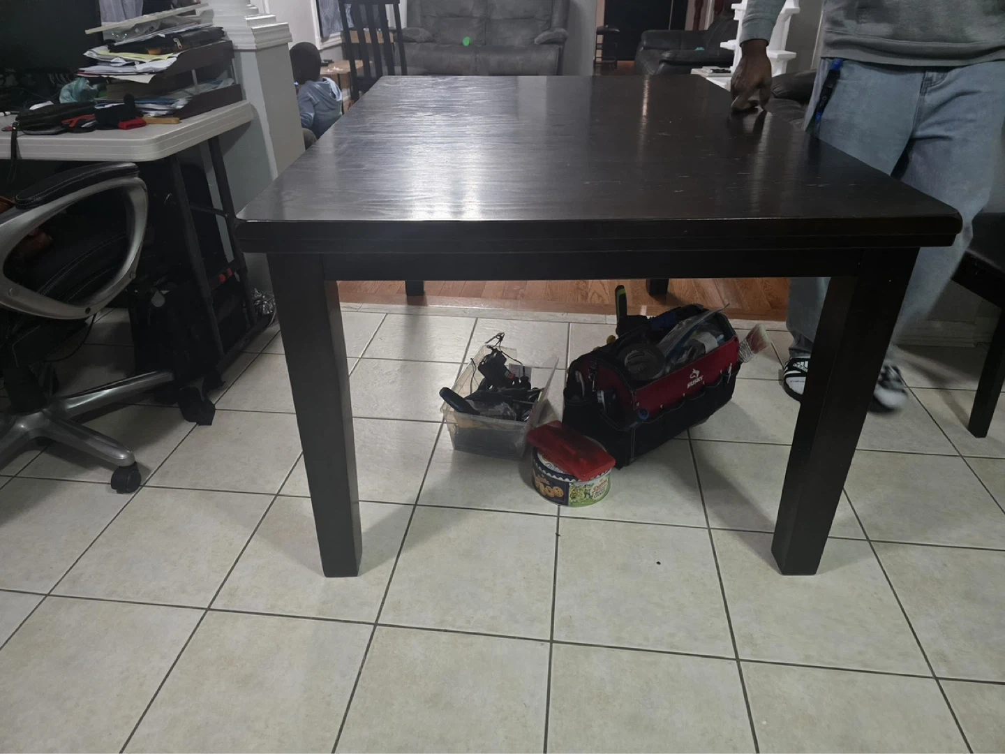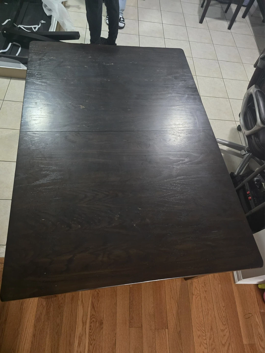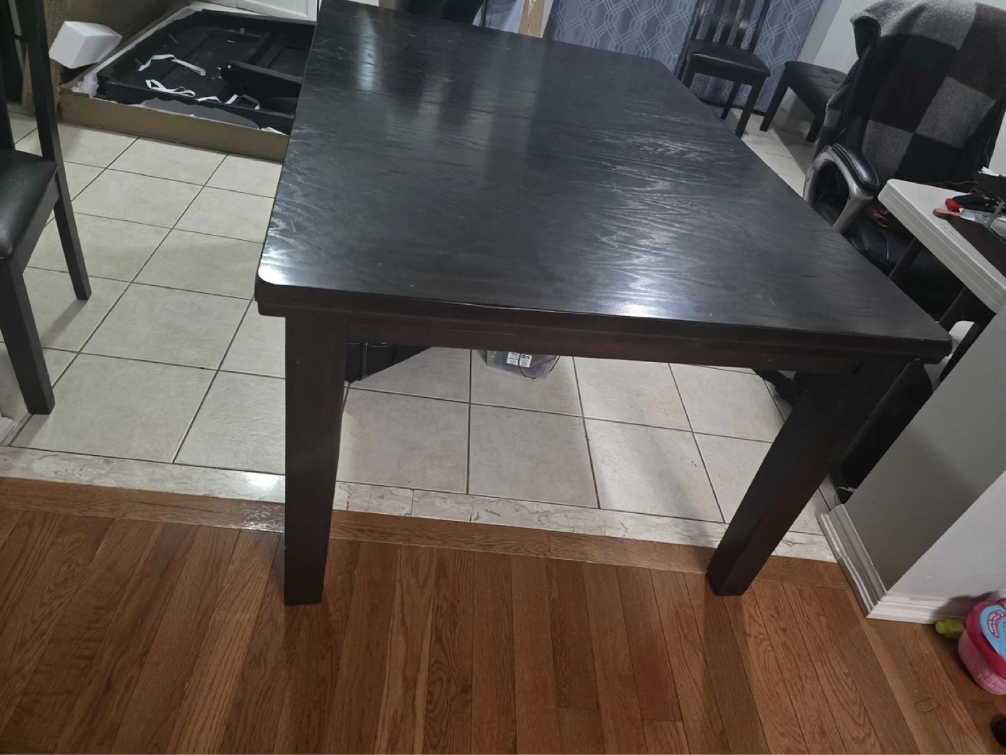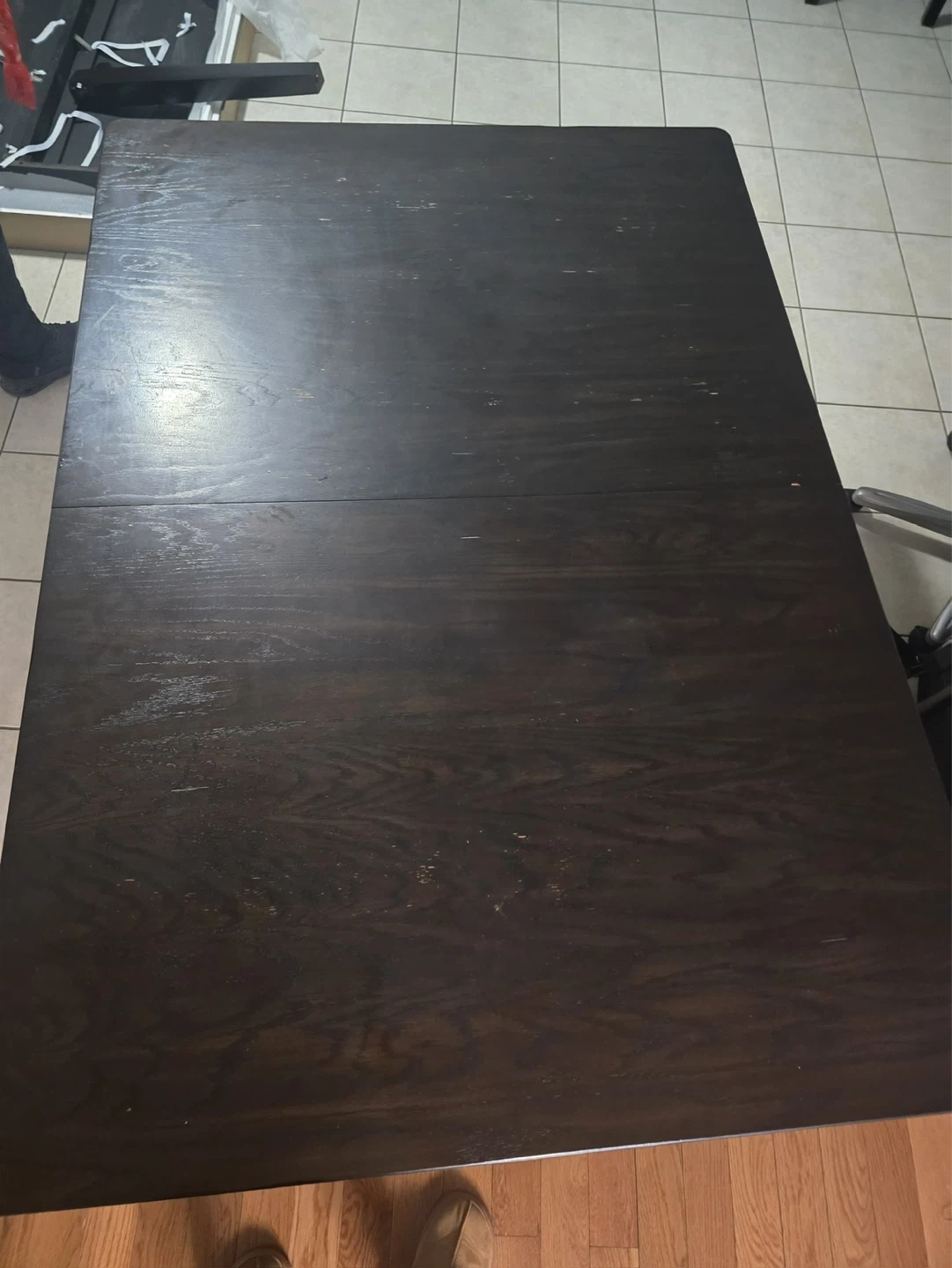 This is a dark wood dining table. It features a sturdy build with four legs. Its rich, dark finish complements many decors. Little scratches that can be concealed with a table cloth