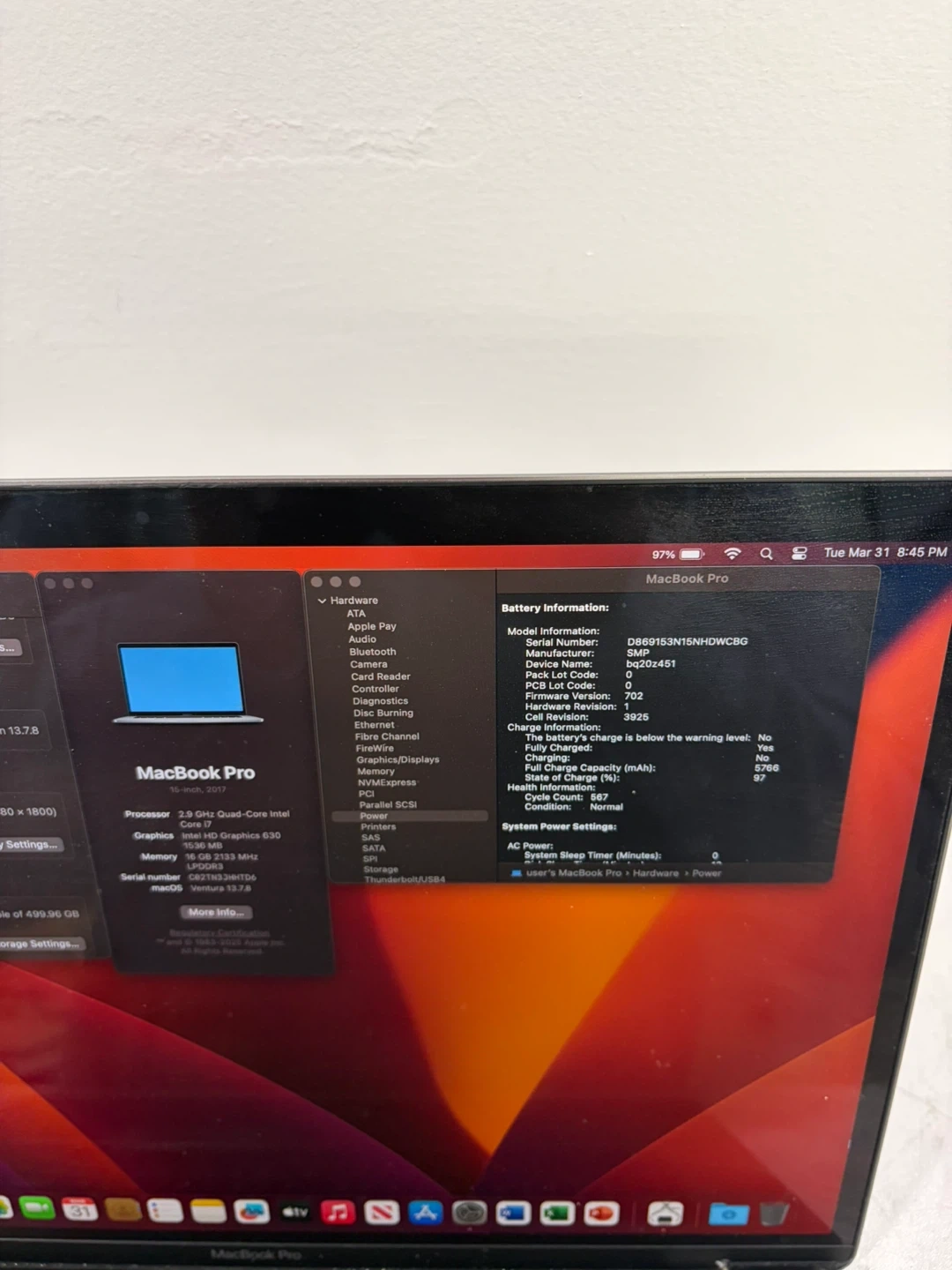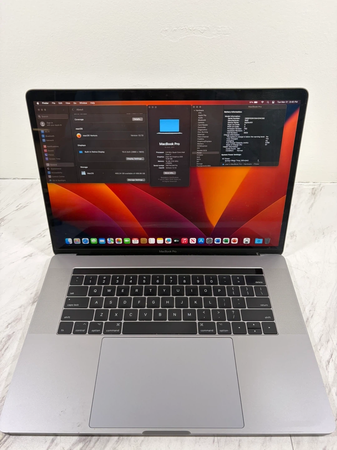 Selling a fast, performance 15 inch 2017 MacBook Pro. Ideal for carrying on the go, productivity tasks, casual and performance use. Runs MacOS Ventura. Long lasting battery with low charge cycles.