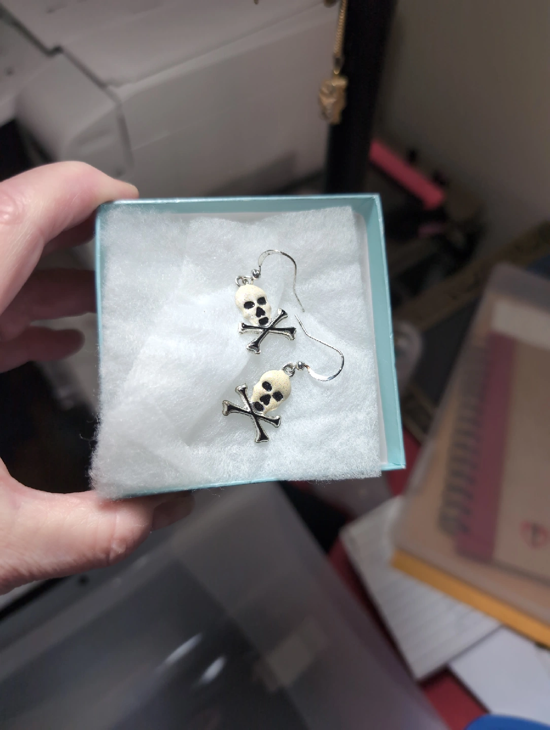95Cute skull and crossbones drop earrings in a box! These earrings are perfect for adding a bit of edge to any outfit. They come in a box, making them great for gifting or keeping them safe when you're not wearing them. Perfect for Halloween