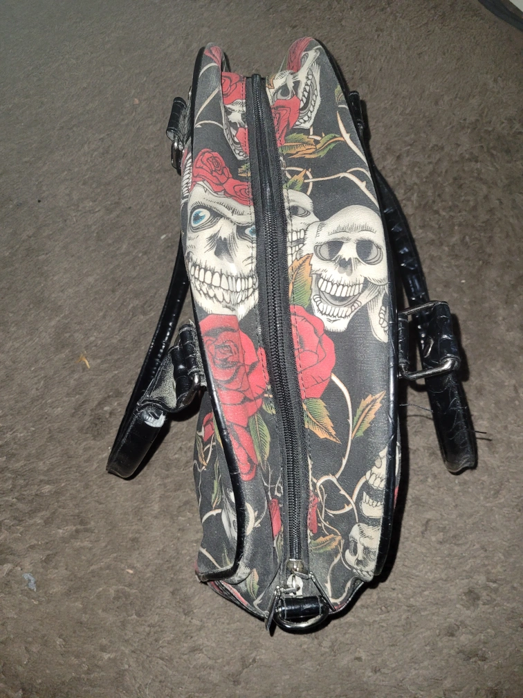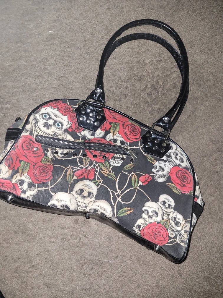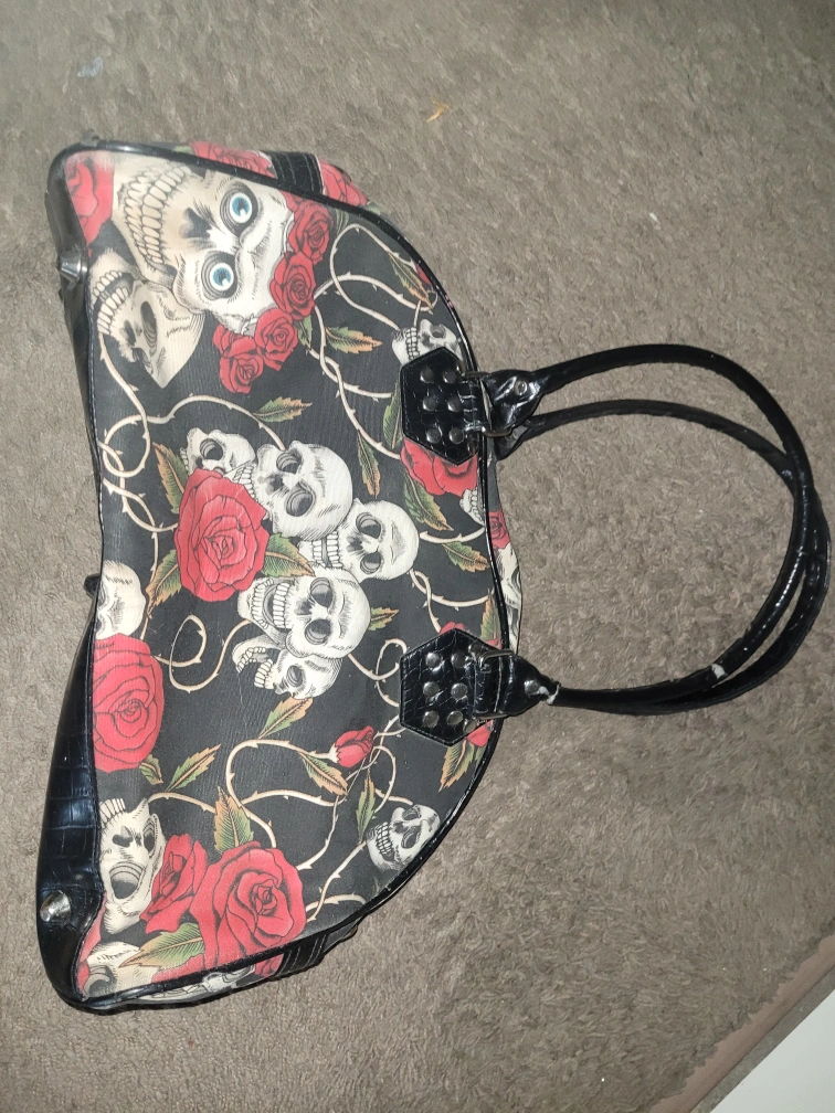 33Unique handbag featuring a skull and roses print! The bag has black handles and trim, and a zippered closure. It's in good condition and ready for a new home! will not respond to calls, only text messages or messages on here
