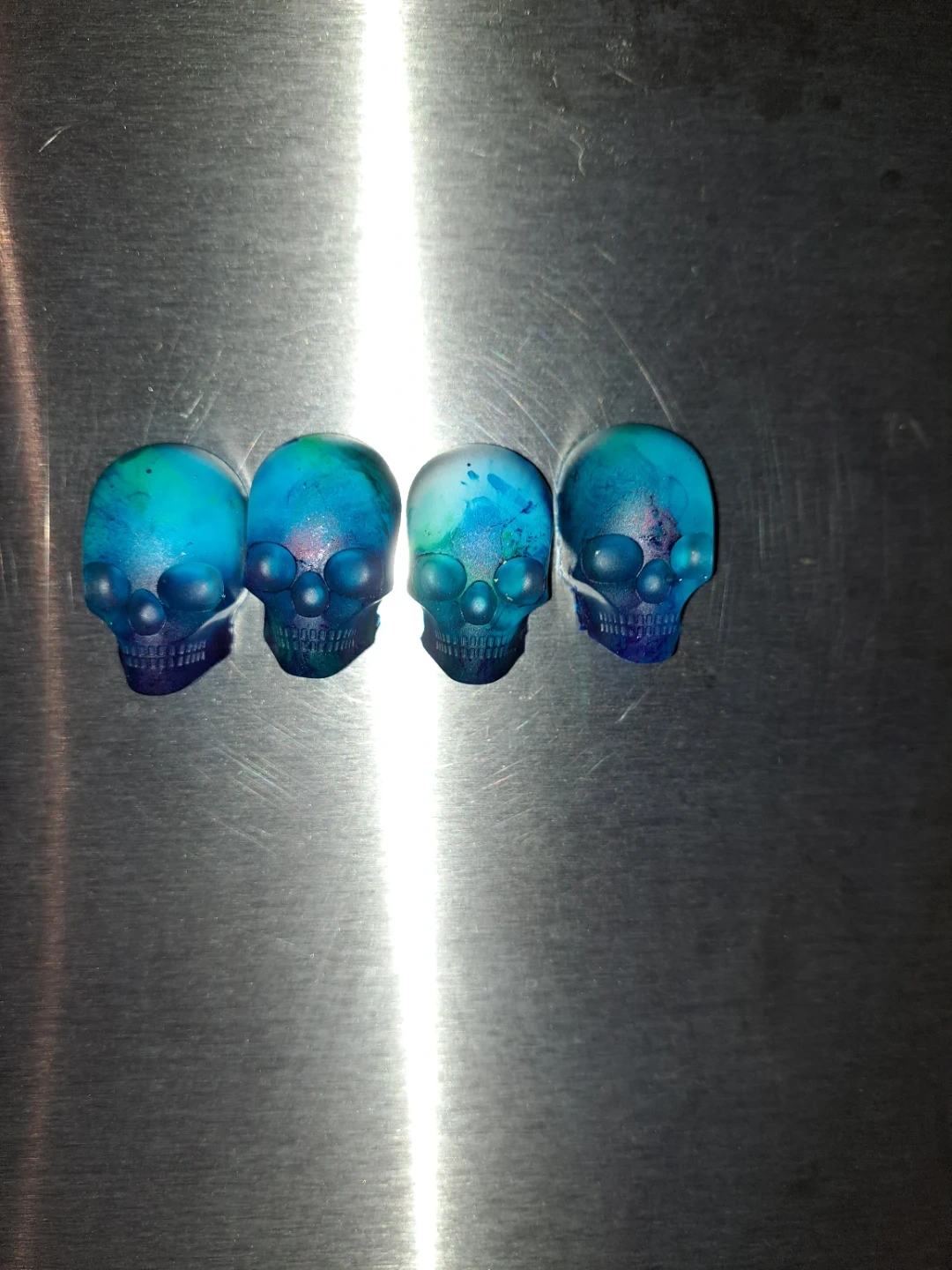 0Here are some unique skull-shaped magnets. They have several shades of blue in an ombre type pattern that goes from dark on the bottom to transparent like on top.