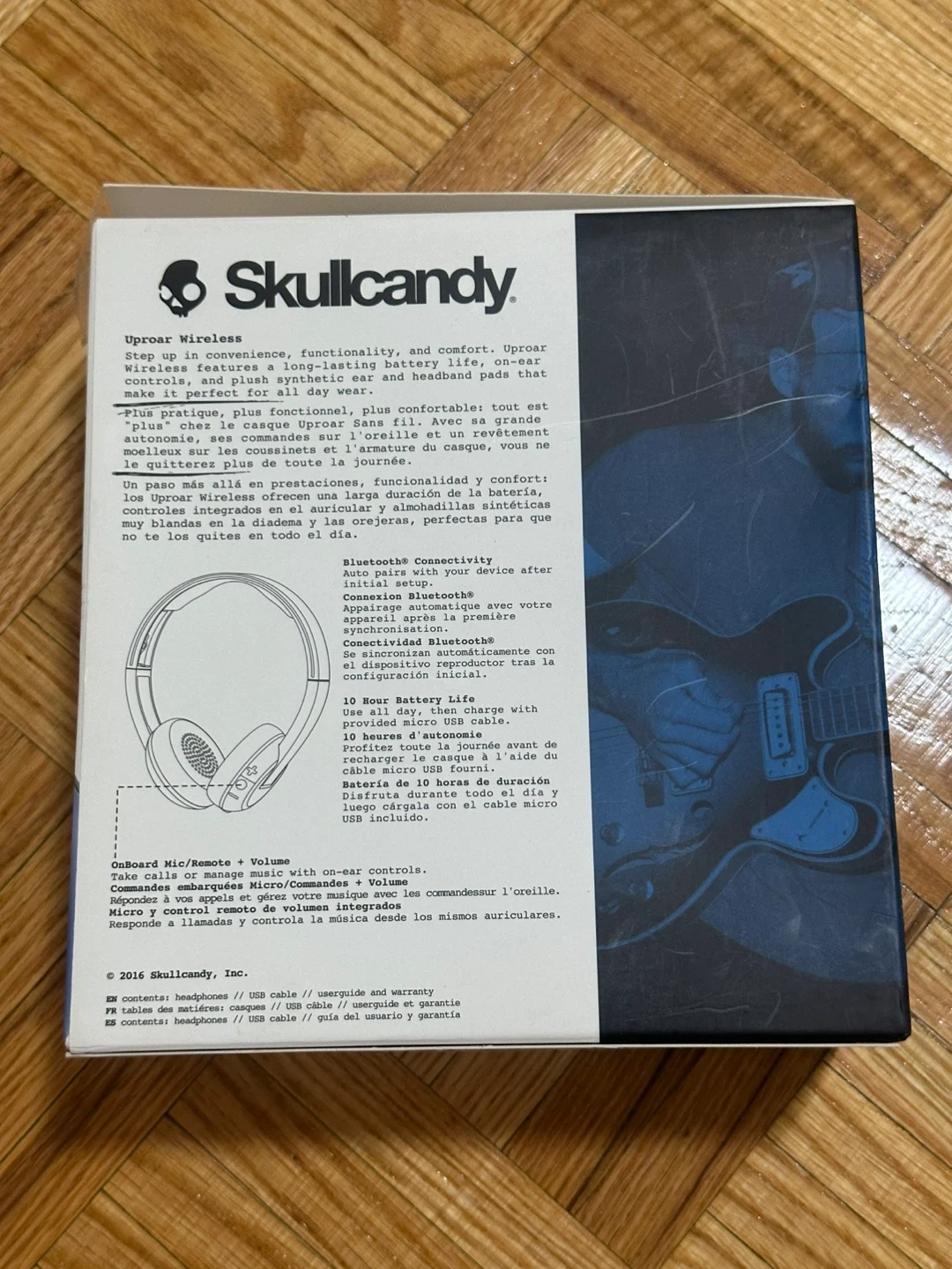 15Brand new unopened box! Selling a pair of Skullcandy Uproar Wireless headphones in blue! Key features include Bluetooth connectivity and 10-hour battery life. There's also an onboard mic and volume control for easy use