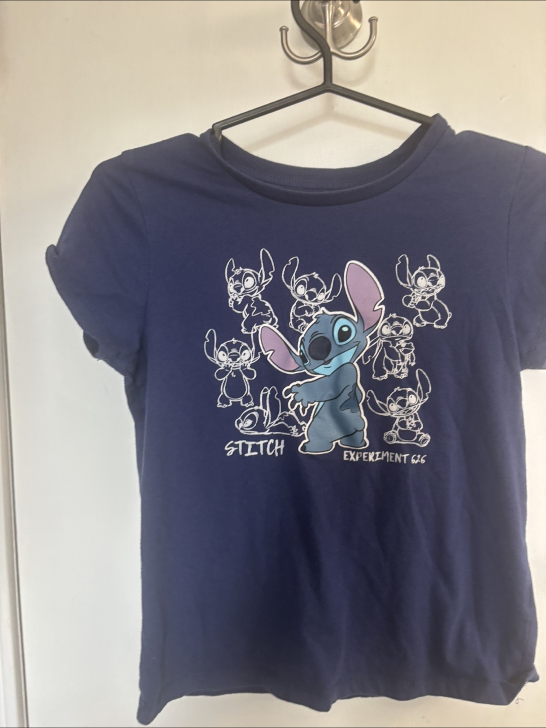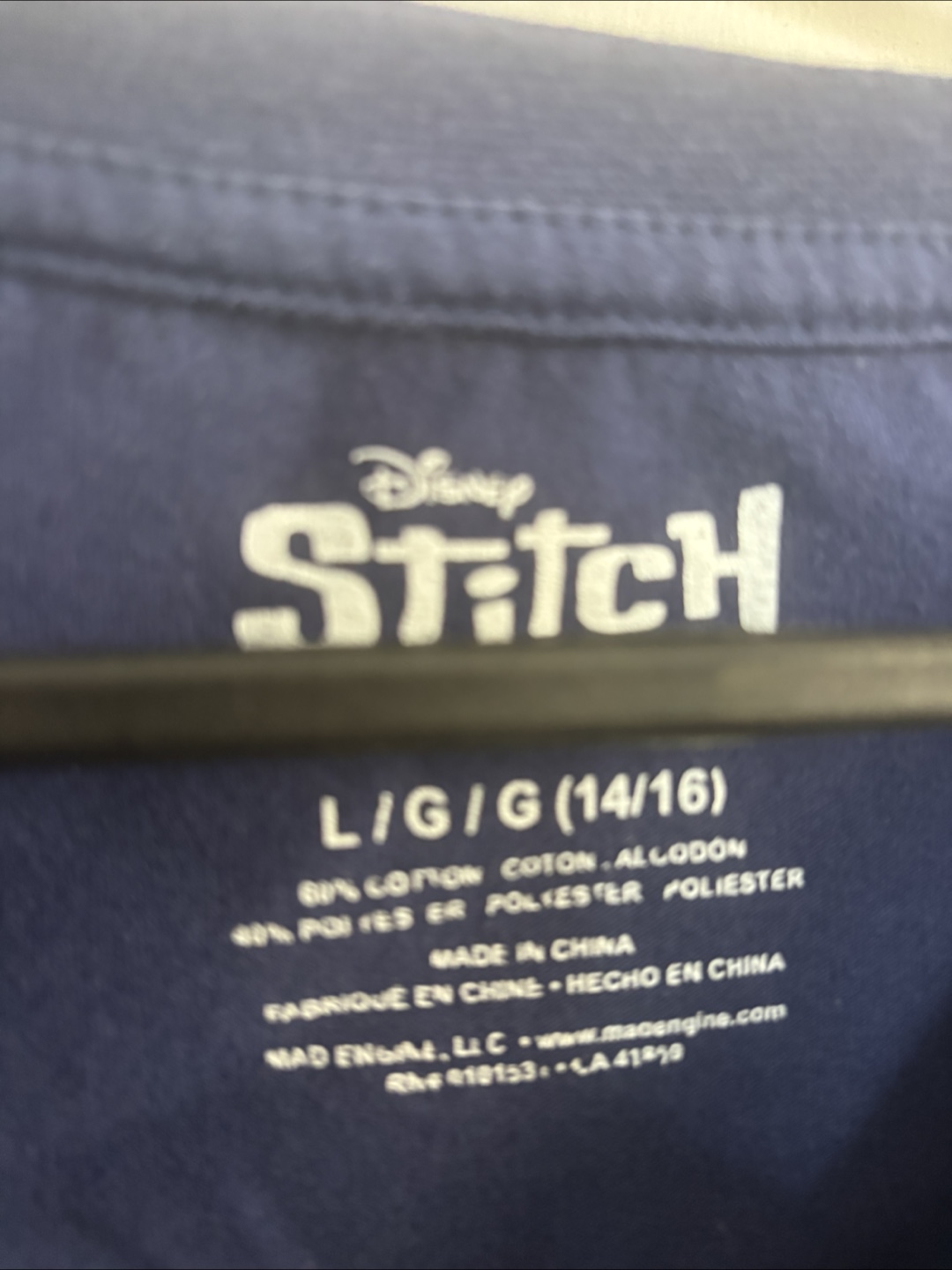 Selling a cute Disney Stitch graphic tee in size Large (14/16)! The shirt is a navy blue colour and features Stitch and the text 'Stitch Experiment 626'. It's made of 60% cotton and 40% polyester