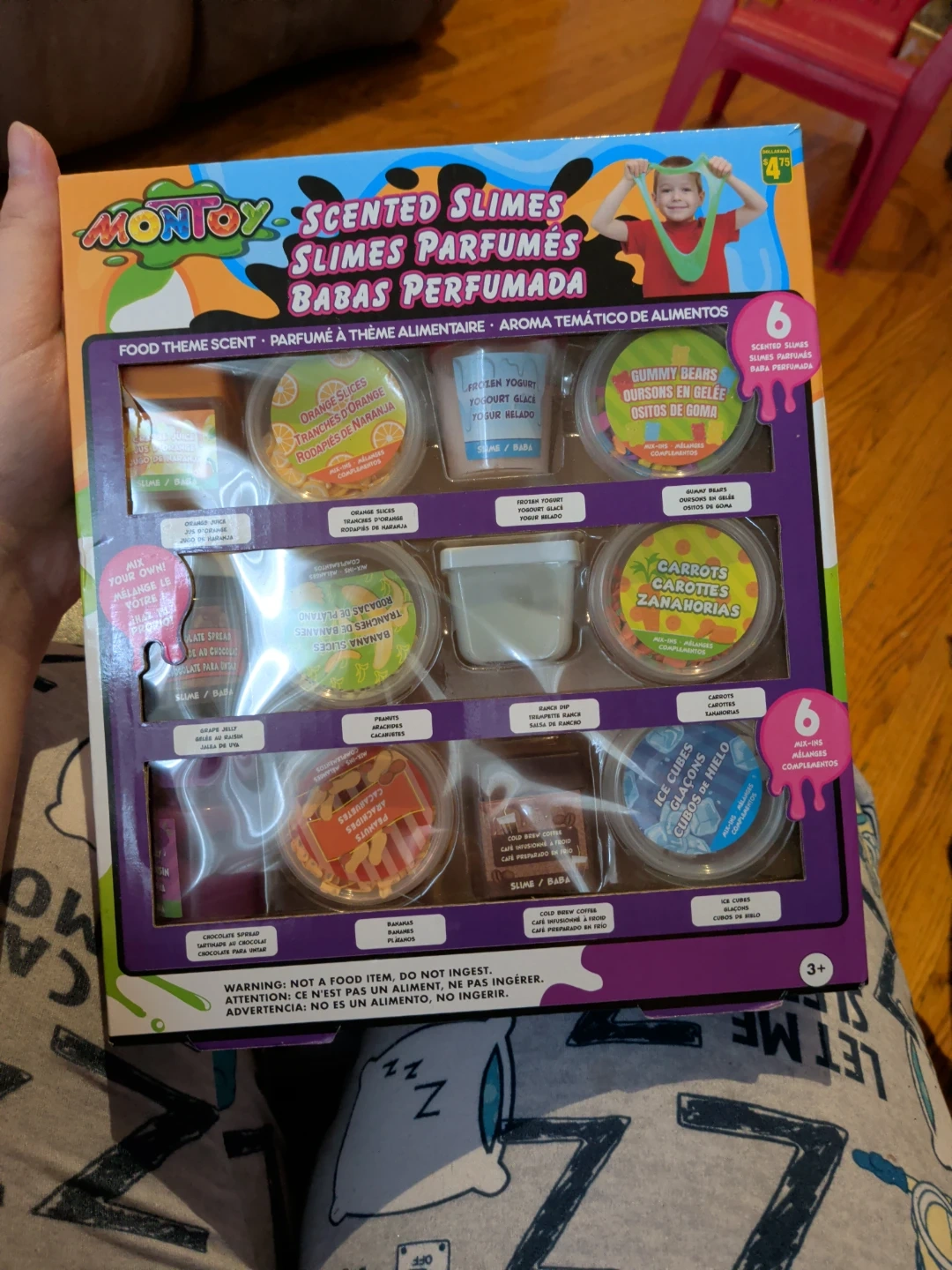 This Montoy set includes six scented slimes with a food theme. Scents include orange juice, orange slices, frozen yogurt, gummy bears, chocolate spread, and bananas. It also comes with ice cubes slime and two mix-ins.