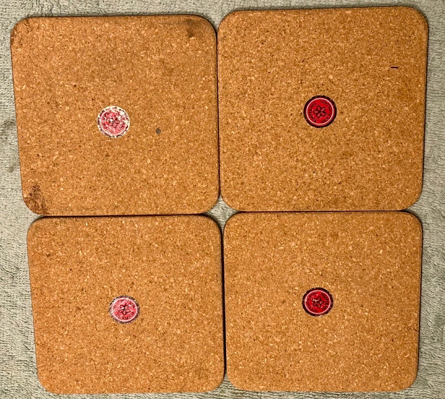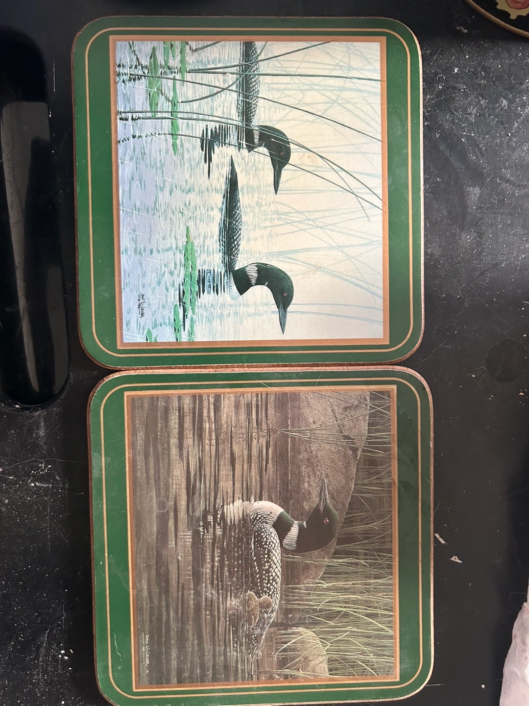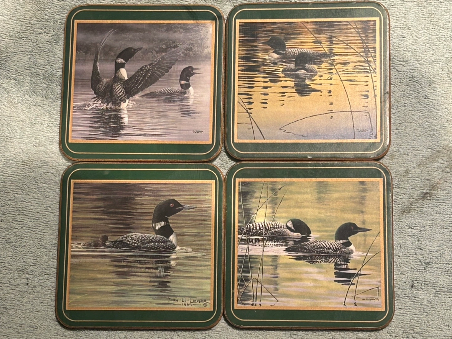 6 square cork coasters. Feature artwork of loons by Jean-Hi Legere. Green border. Made in England.