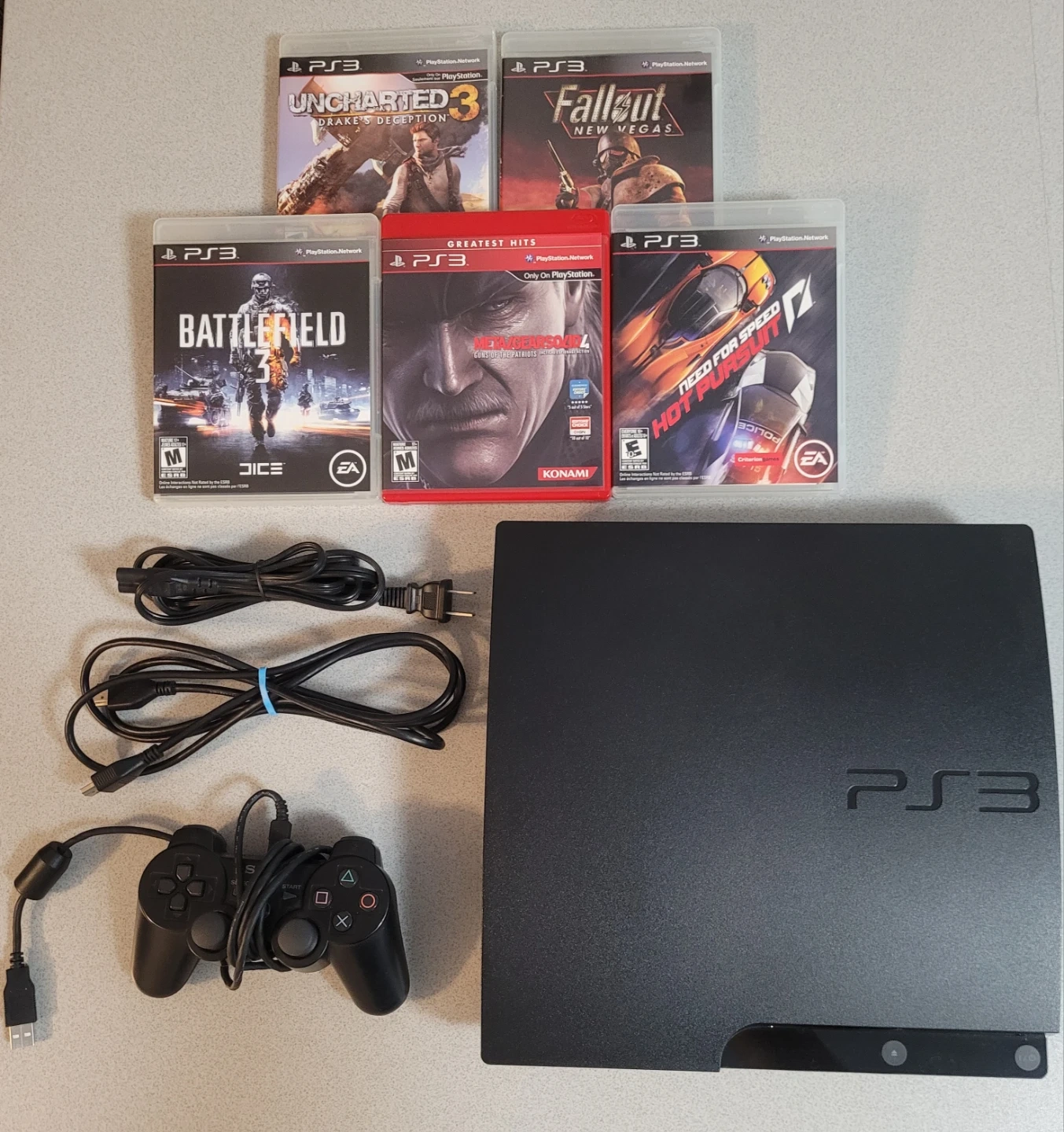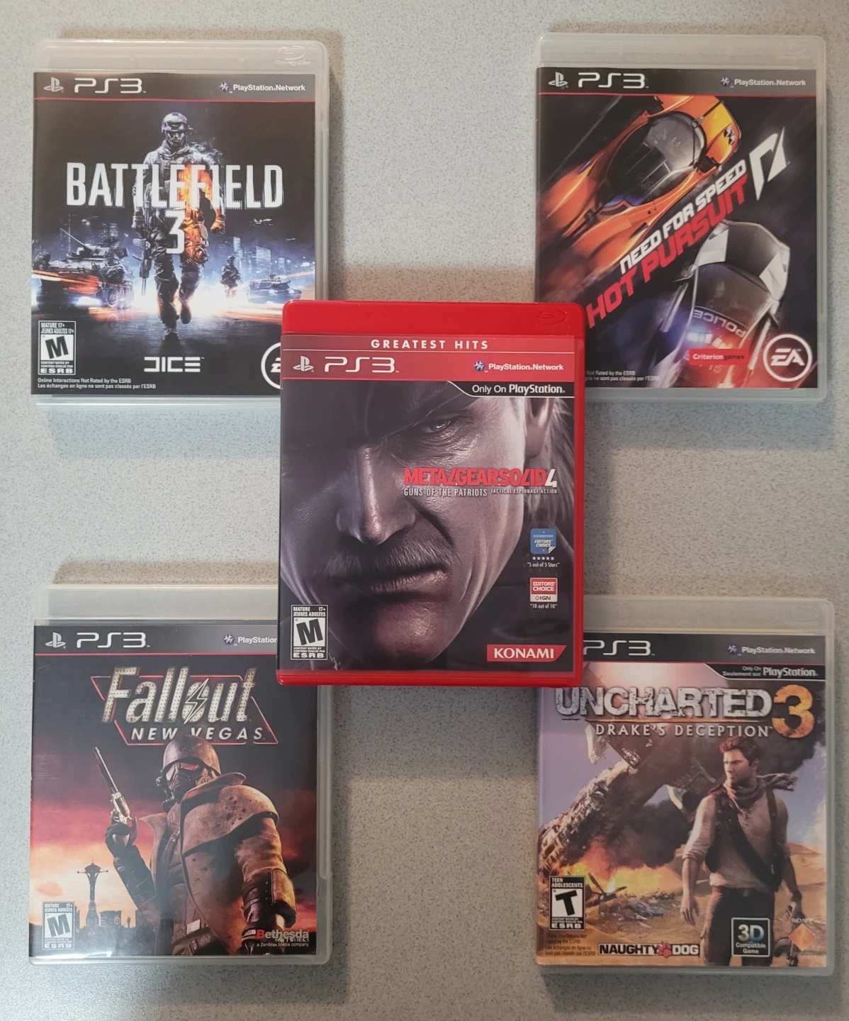 - Five games (all scratch-free): Battlefield 3, Need for Speed Hot Pursuit, Metal Gear Solid 4, Fallout: New Vegas, and Uncharted 3: Drake's Deception.