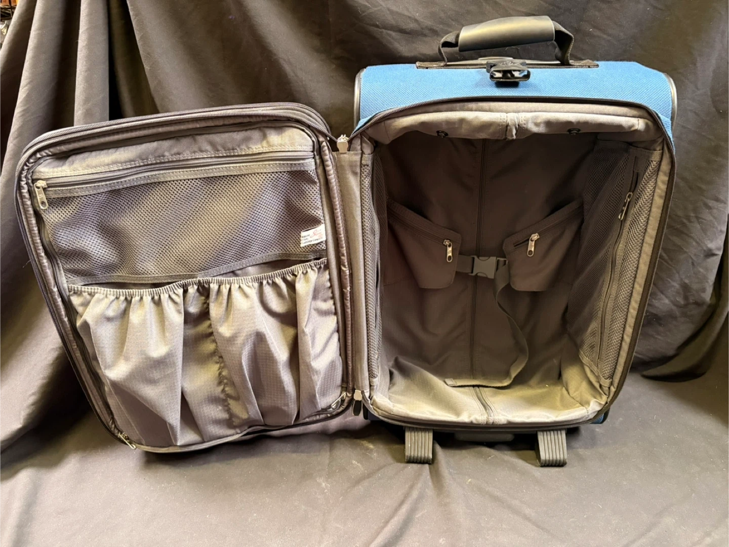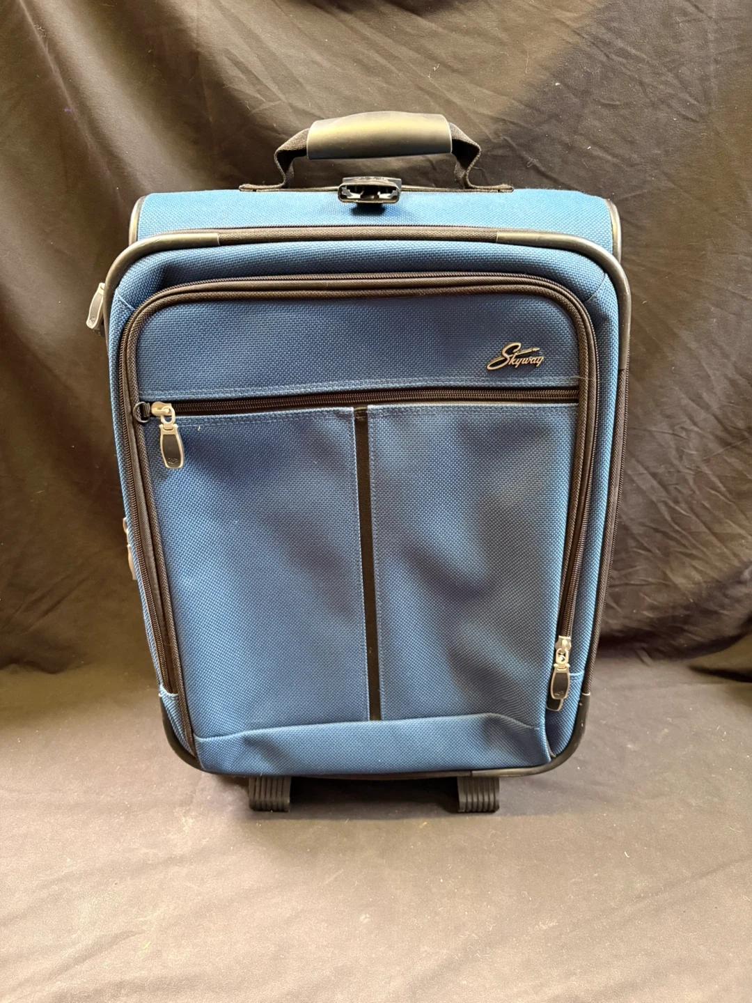 1000+Good good condition Skyway Rolling Carry-On Luggage - Blue Selling a Skyway rolling carry-on suitcase in blue. It has a retractable handle and wheels for easy transport. The interior has multiple compartments for organization. It shows some signs of use on the wheels, but is otherwise in great condition! Measurements in last couple of pics $20 Pick up Victoria Park & O’Connor area
