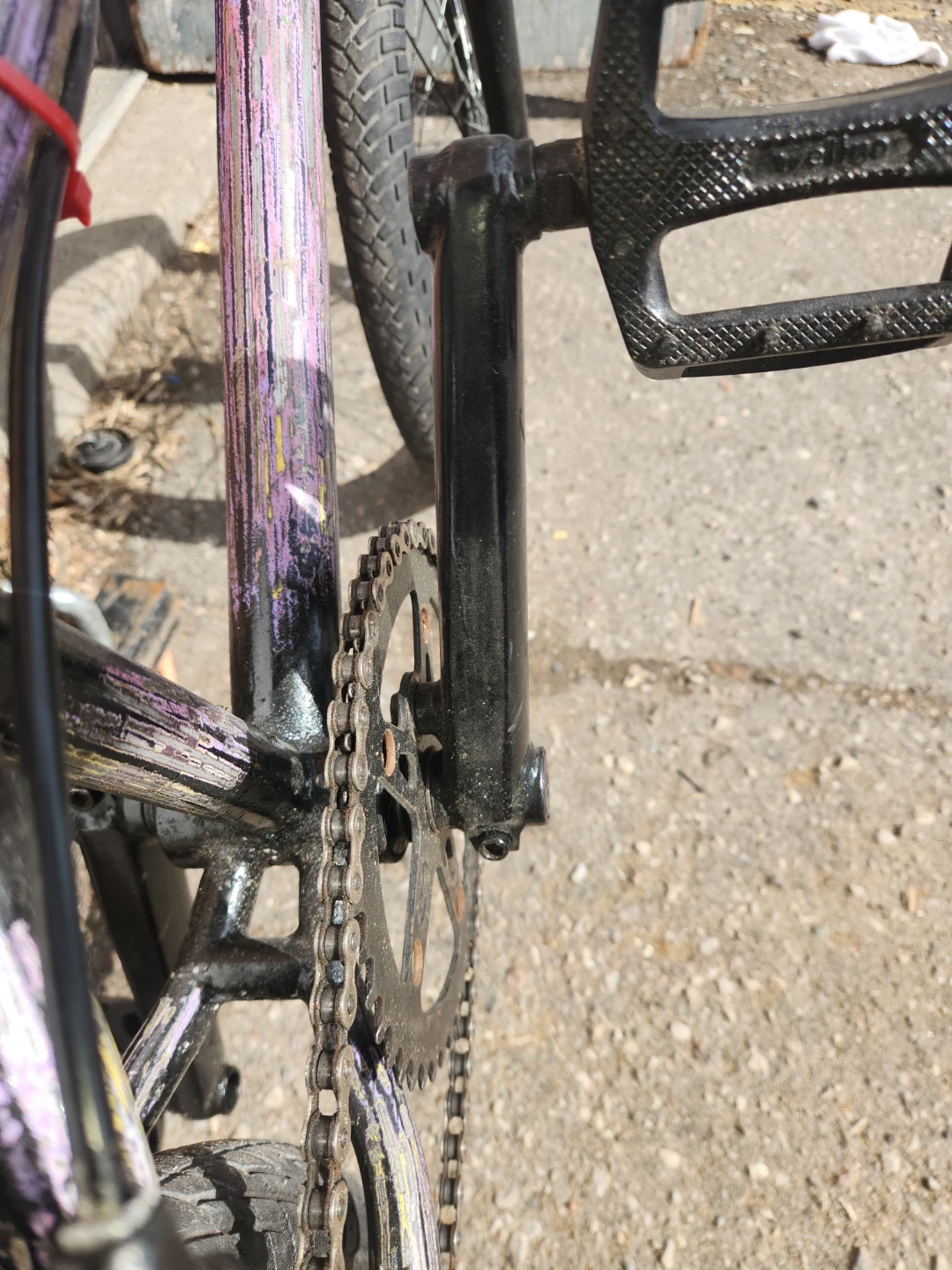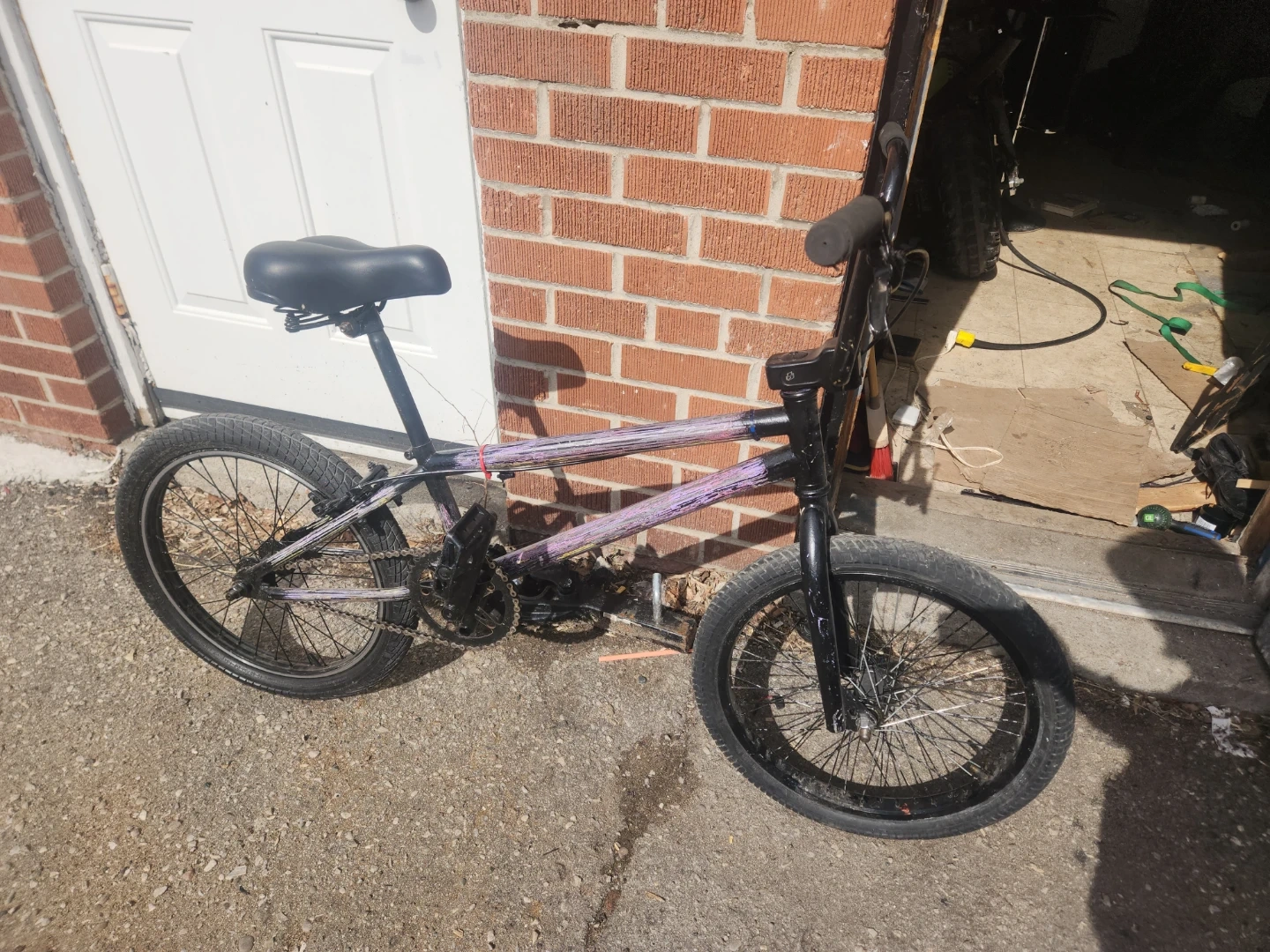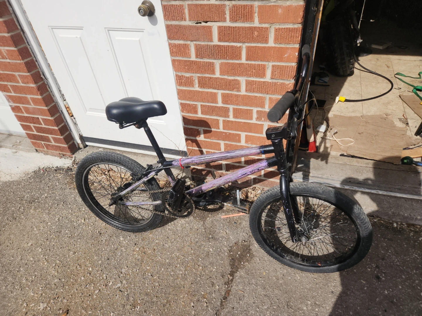 It has been stored properly, This is a BMX bike with a purple and black frame. It has two wheels and a chain drive system. Perfect for riding around the neighbourhood!