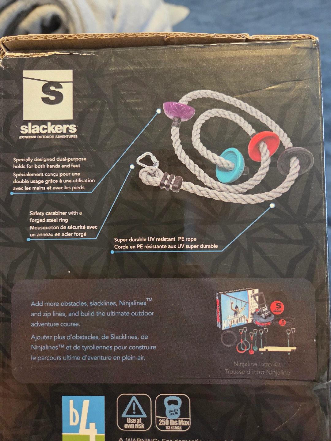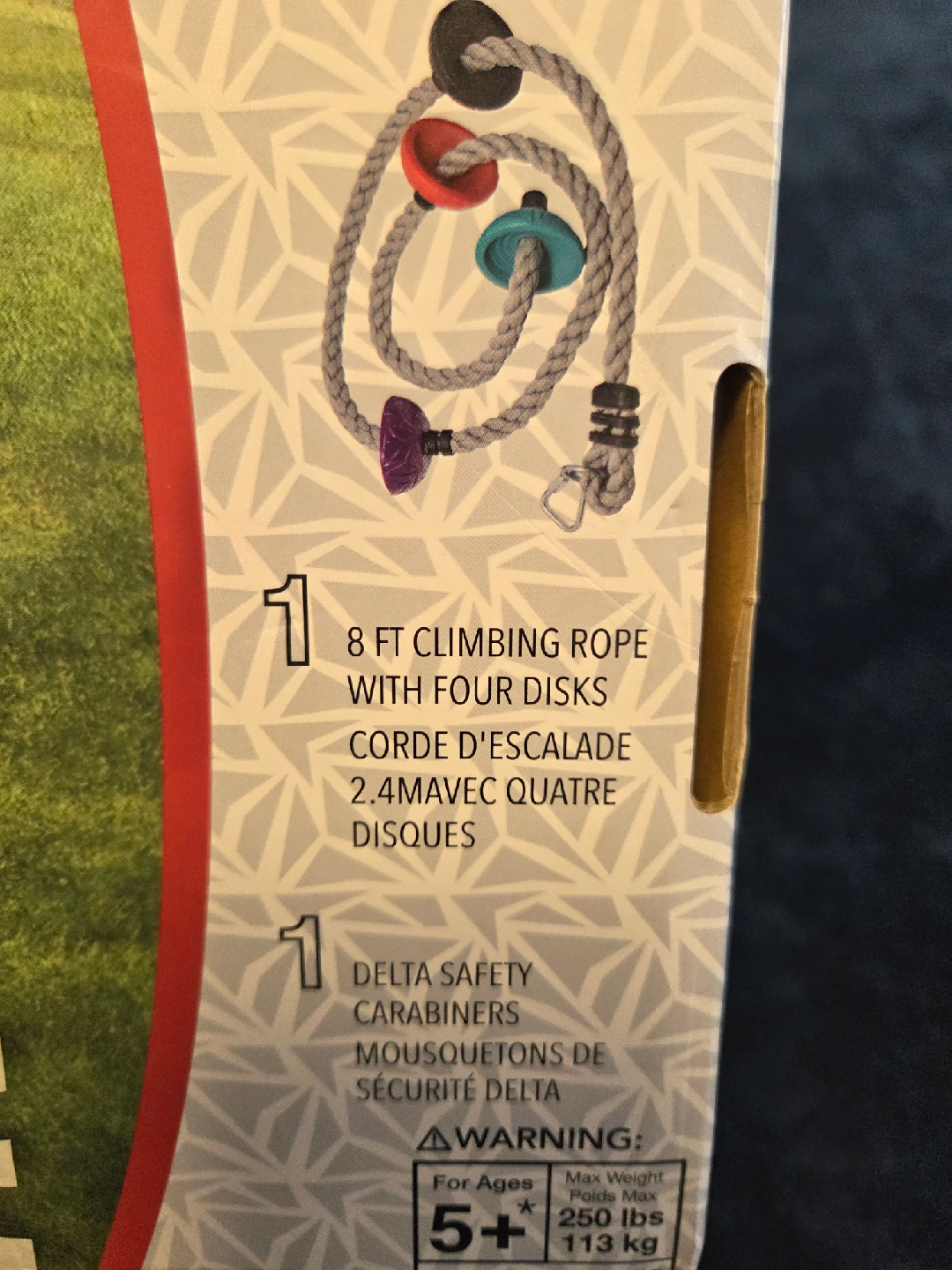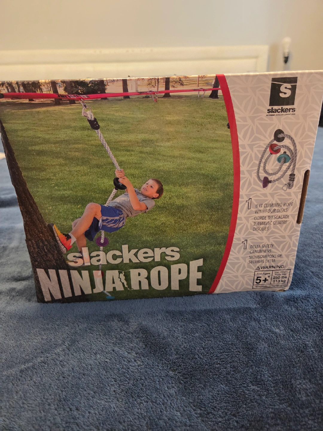 Get your little ninja ready for some outdoor fun with this Slacker Ninja Rope! It's an 8 ft climbing rope with four disks. Perfect for kids aged 5 and up! The set includes delta safety carabiners and can hold up to 250 lbs. Add it to your backyard for the ultimate adventure course