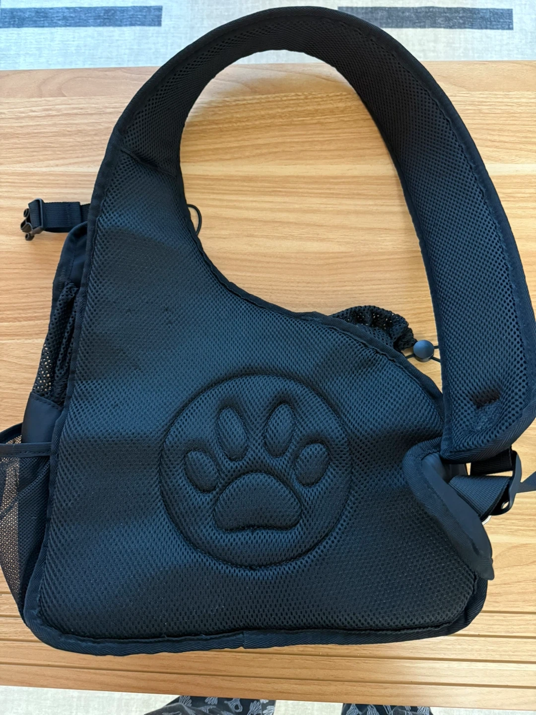 Check out this handy black pet sling carrier! It's perfect for keeping your furry friend close while you're out and about. The carrier features a comfy shoulder strap and multiple pockets for storing essentials like treats or waste bags. It's in great condition and ready for a new home!