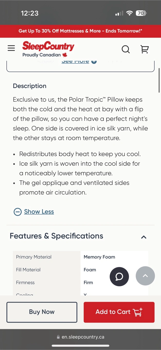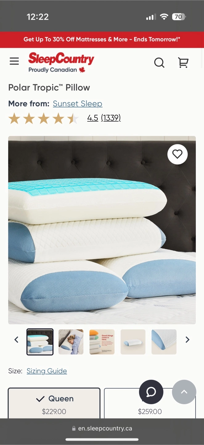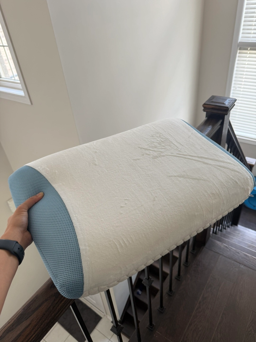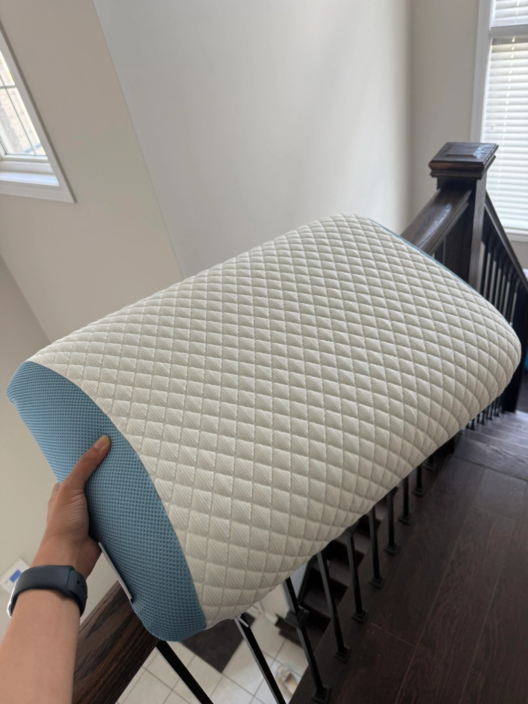 Selling a Sleep Country Polar Tropic pillow in queen size. It's designed to keep you cool at night with its ice silk yarn on one side. The pillow also features gel applique and ventilated sides to promote air circulation. It's made with memory foam and foam fill material. It has been gently used for 3 months with double pillow cases on it but it is in great condition. Purchased for $229 plus tax