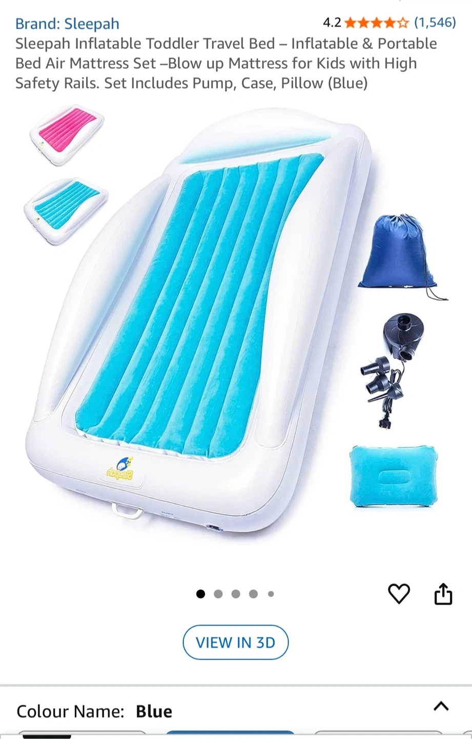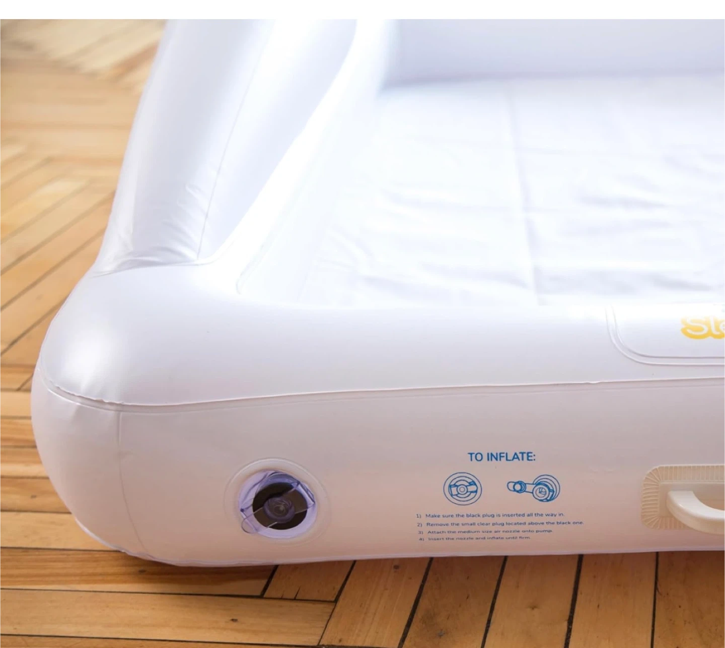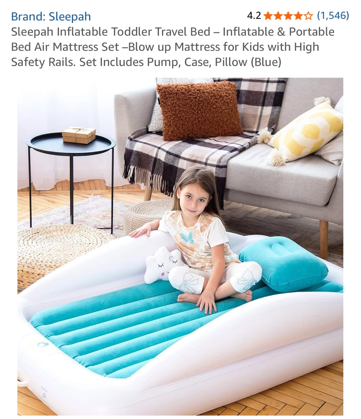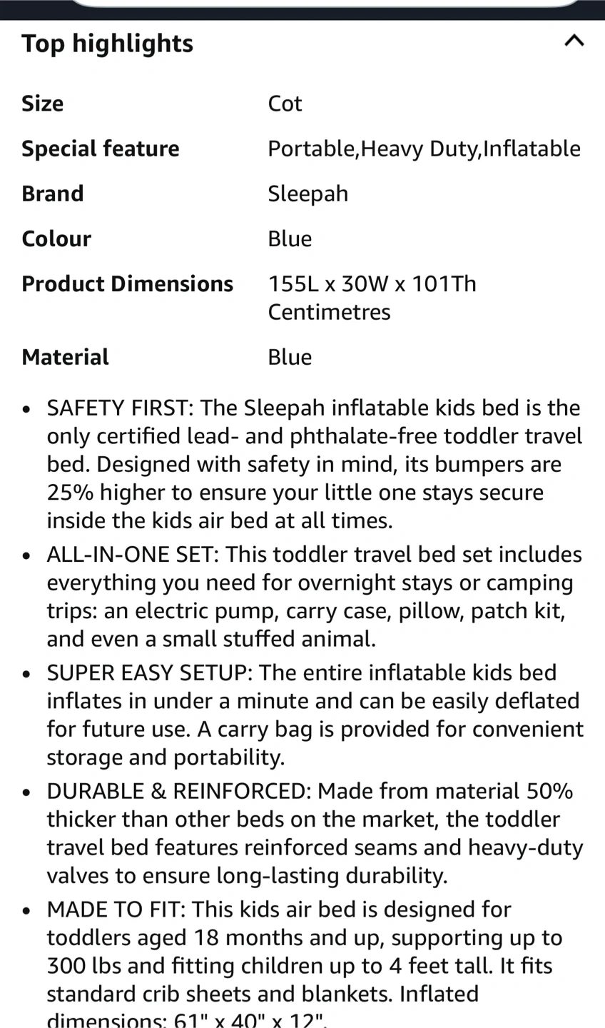New Looking to sell a Sleepah inflatable toddler travel bed! It's in great shape and comes with everything you need for overnight stays or camping trips. - Includes an electric pump, carry case, pillow, patch kit, and even a small stuffed animal - Designed for toddlers aged 18 months and up, supporting up to 300 lbs and fitting children up to 4 feet tall - Made from material 50% thicker than other beds on the market, with reinforced seams and heavy-duty valves for long-lasting durability - Dimensions: 155L x 30W x 101H Centimetres