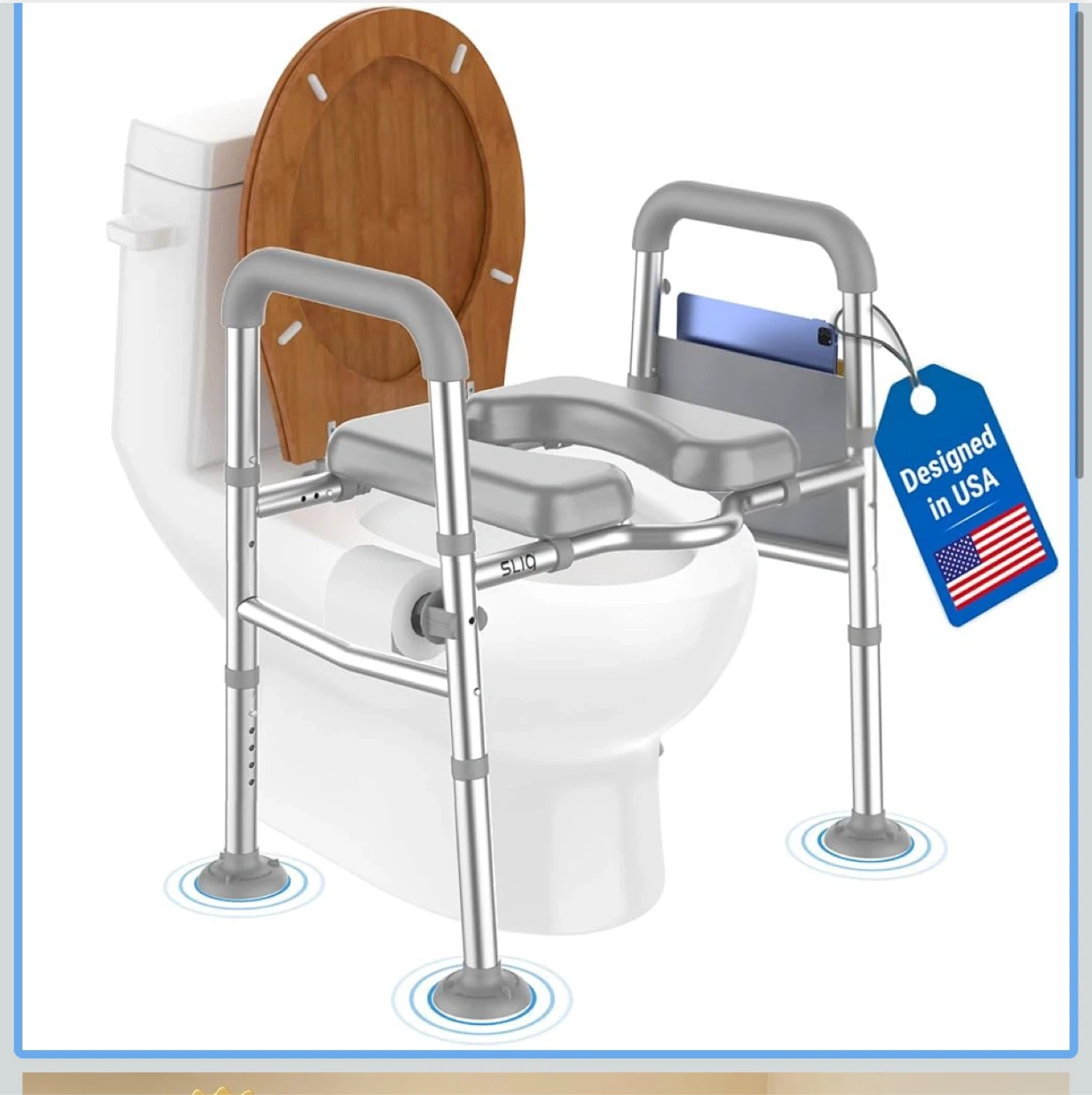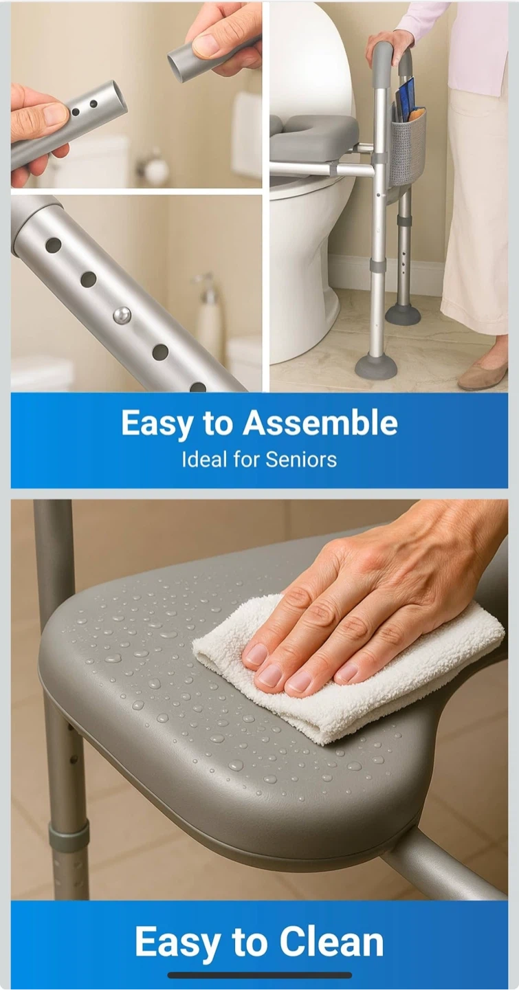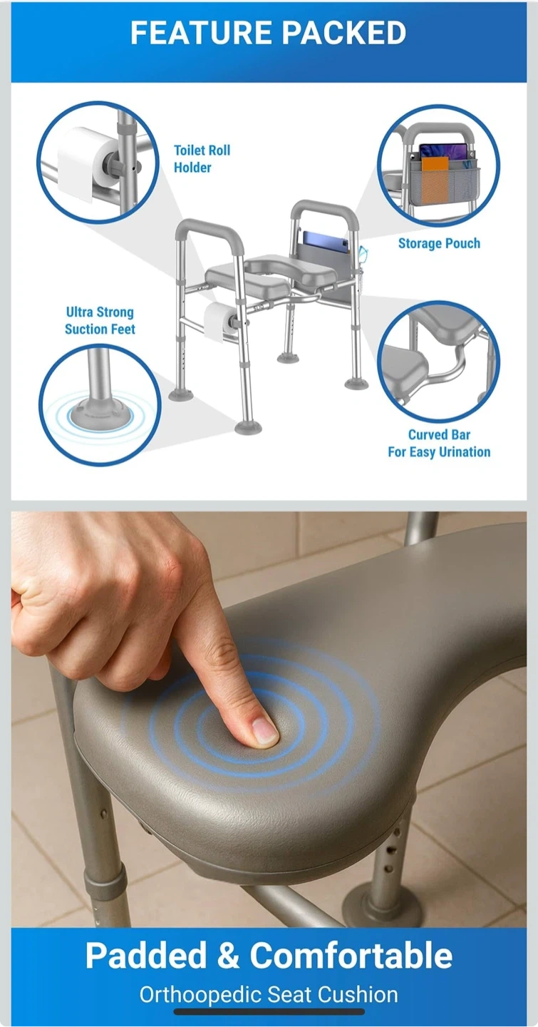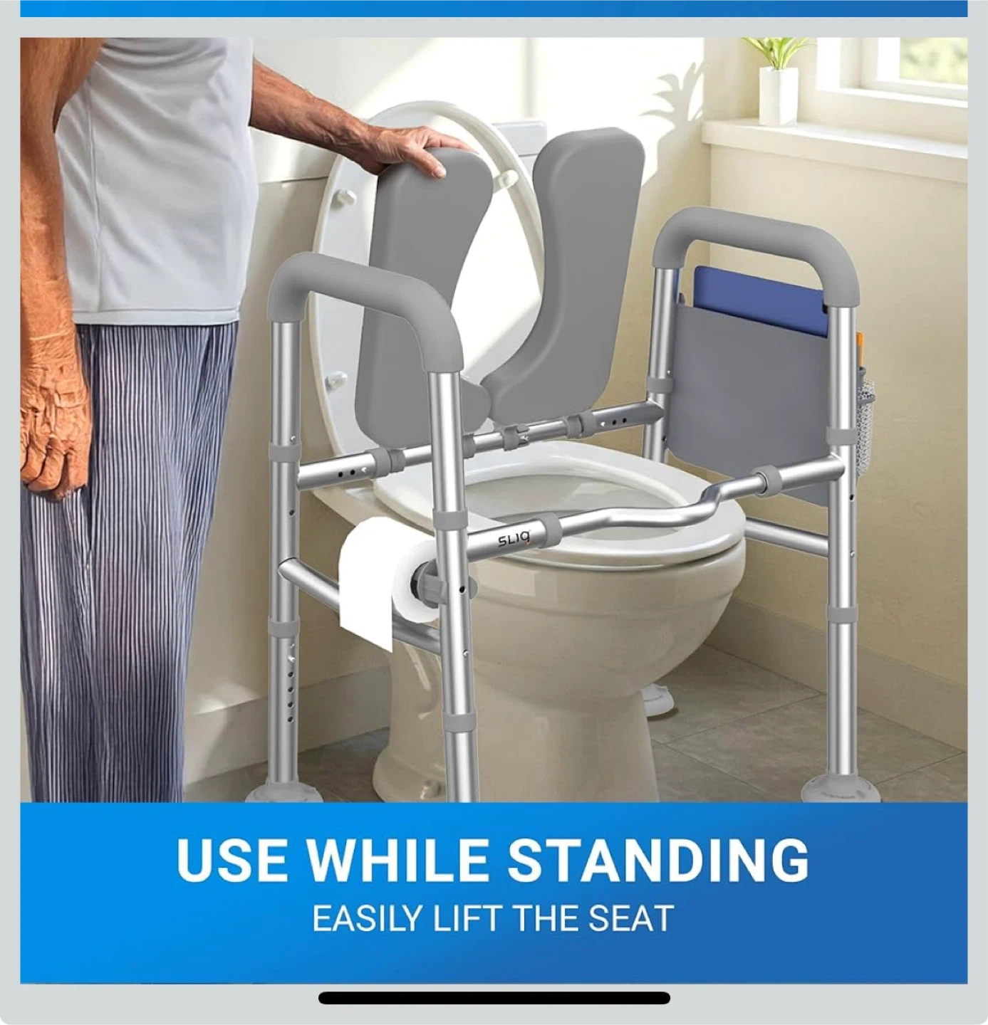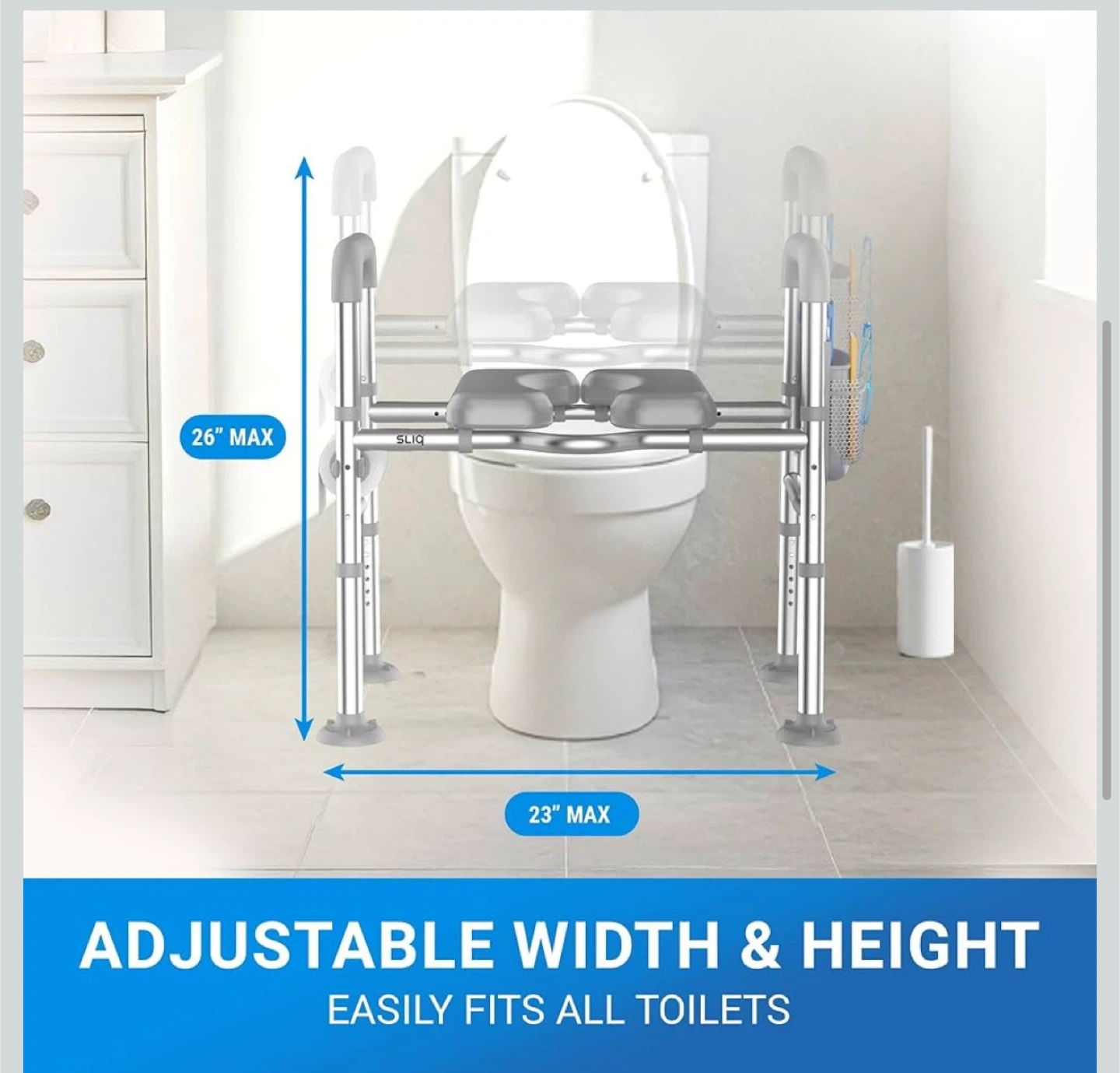 This SLIQ Stand Assist Toilet Safety Frame is designed for easy assembly and cleaning. It's ideal for seniors, featuring adjustable width and height to fit most toilets. The frame is packed with features like a toilet roll holder, storage pouch, and ultra-strong suction feet. The padded seat cushion provides comfort, and the curved bar allows for easy urination. It's designed in the USA and helps users easily lift the seat while standing