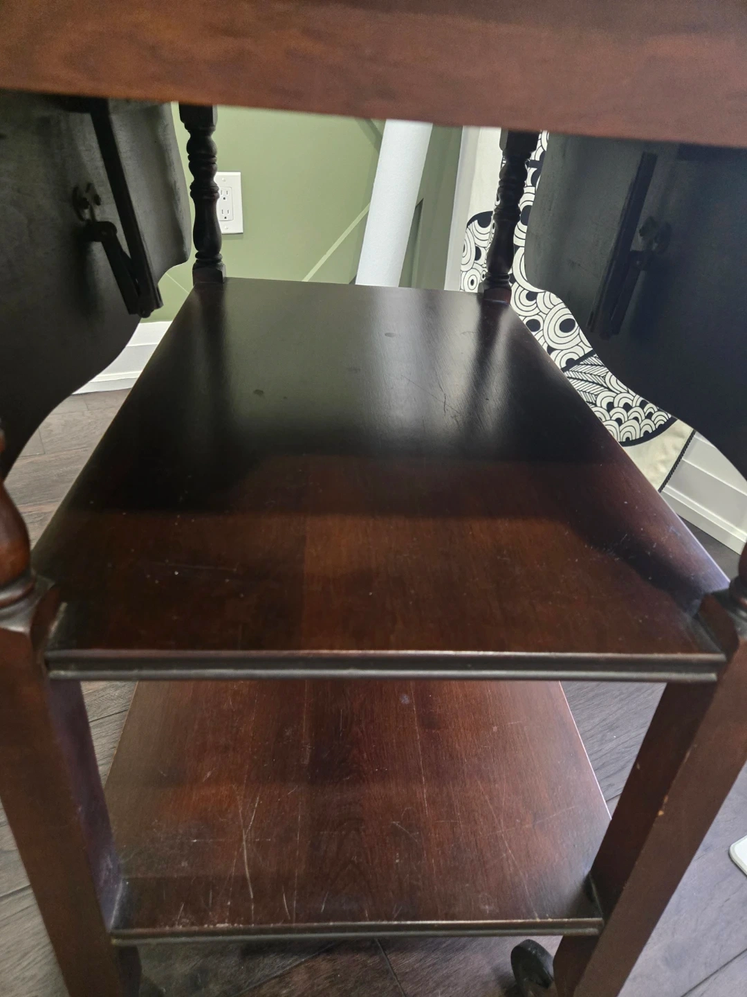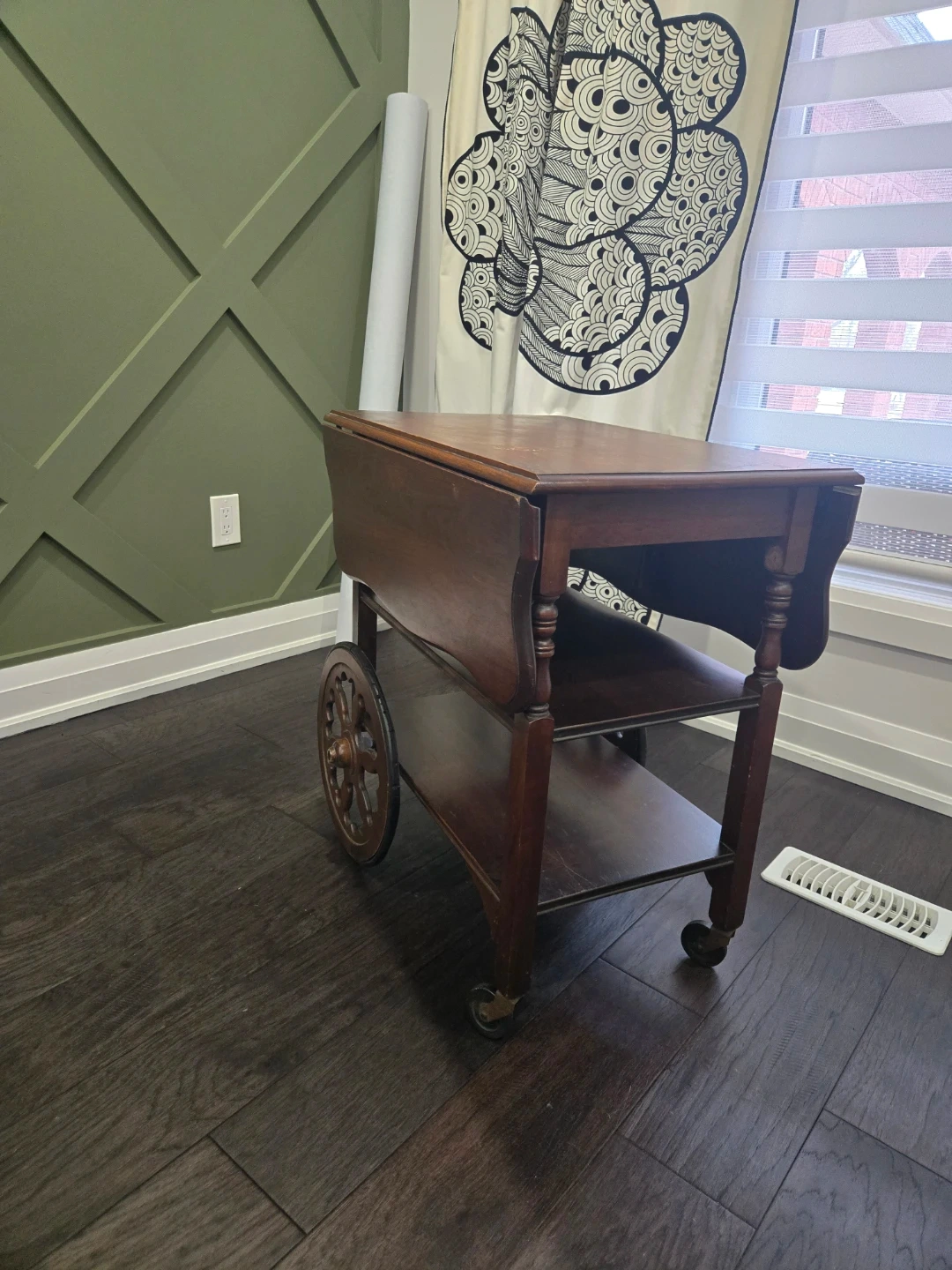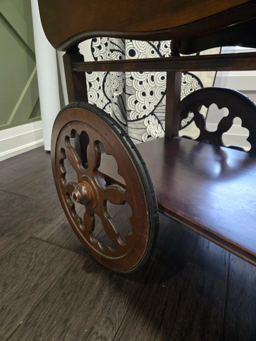 This wooden serving cart has drop-leaf sides for extra surface space when needed. It features two shelves and decorative wheels. The wood has a rich, dark finish.