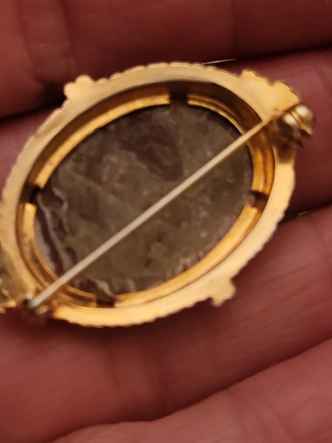 This oval brooch features a beautiful agate stone with intricate patterns of red, white, and brown. It's set in a decorative gold-tone metal frame with beaded detailing. The backing has a secure pin closure. It's a lovely accessory for adding a touch of vintage charm to an outfit.