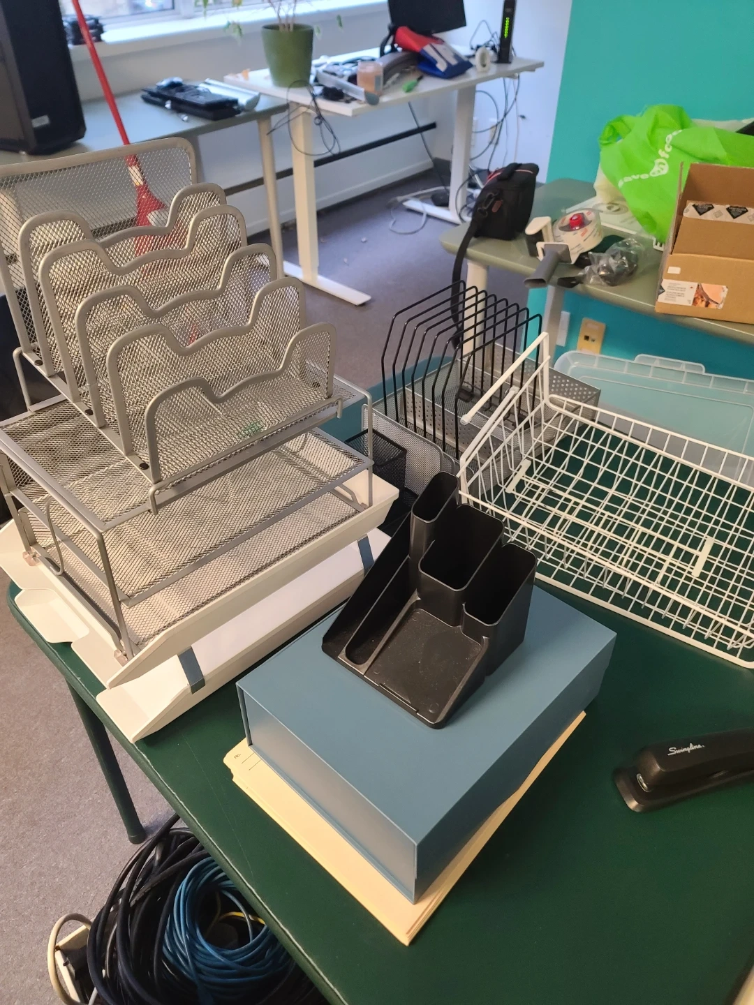 Declutter your workspace with these handy desk organizers! Included are a mesh file holder, a black desk organizer with multiple compartments, and a blue storage box. Perfect for keeping your documents and supplies neatly arranged