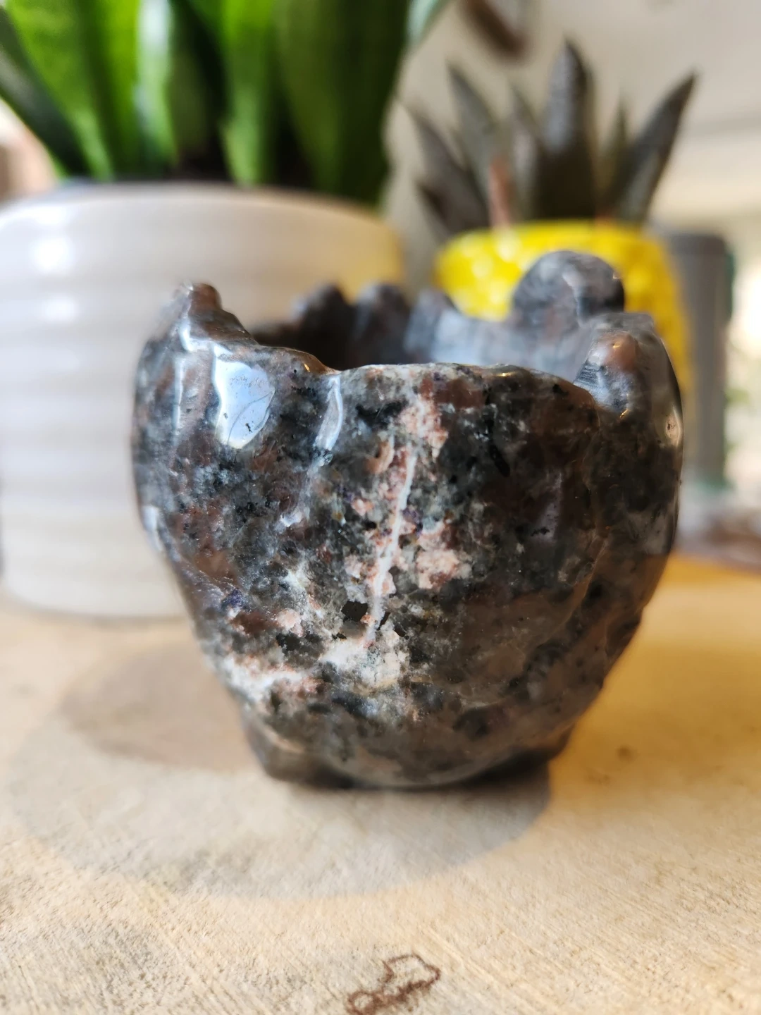 Under UV light, this unique stone reveals its signature glowing specks—making it both a functional bowl and a conversation-starting display piece. Perfect for holding small treasures, crystals, or simply showcasing its bold, edgy beauty.