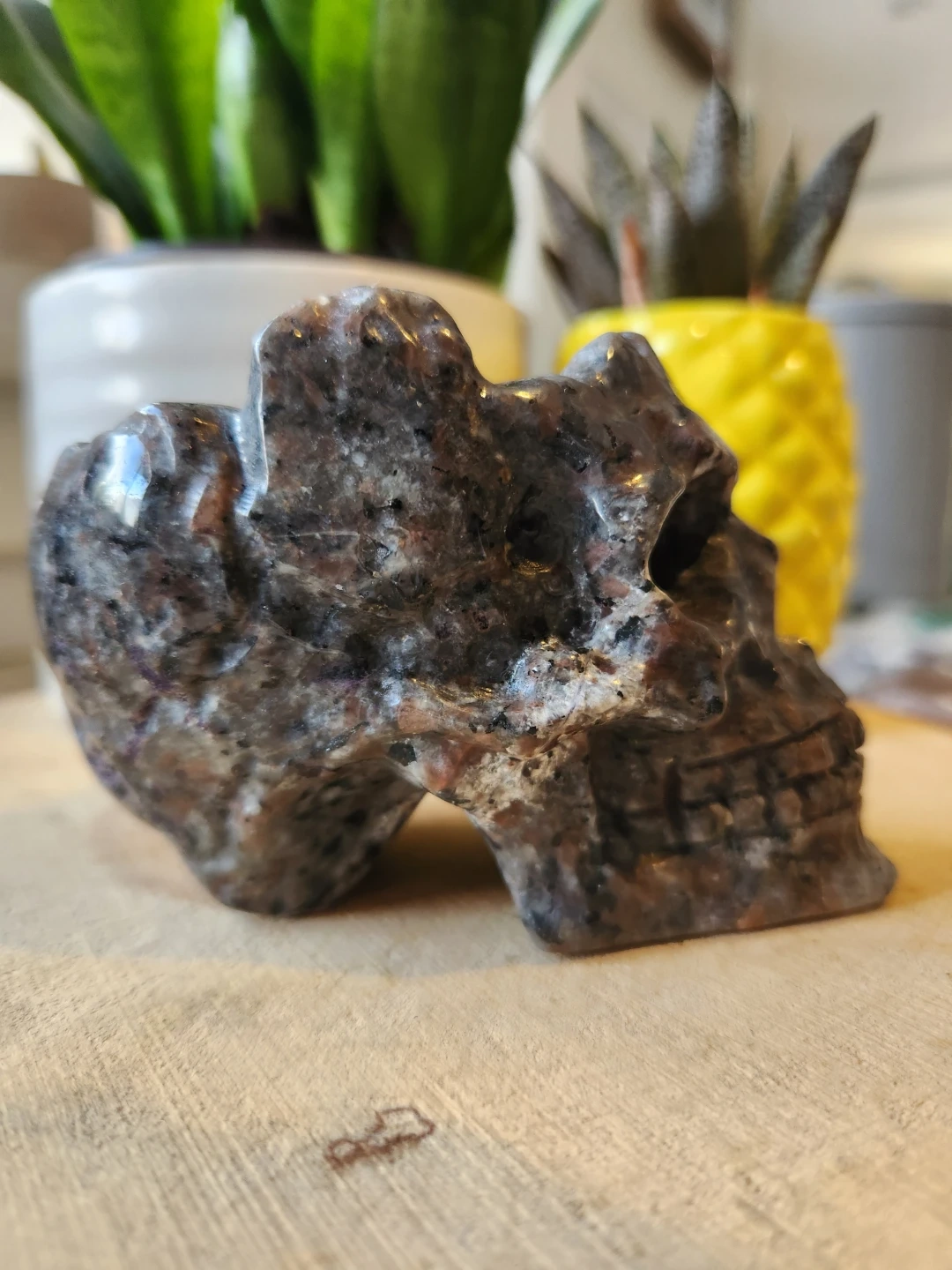 Dark, moody, and full of hidden magic, this Yooperlite skull bowl is a striking statement piece. Carved with detailed features and natural marbling in deep charcoal, grey, and subtle earthy tones, it carries a mysterious, almost ancient energy.