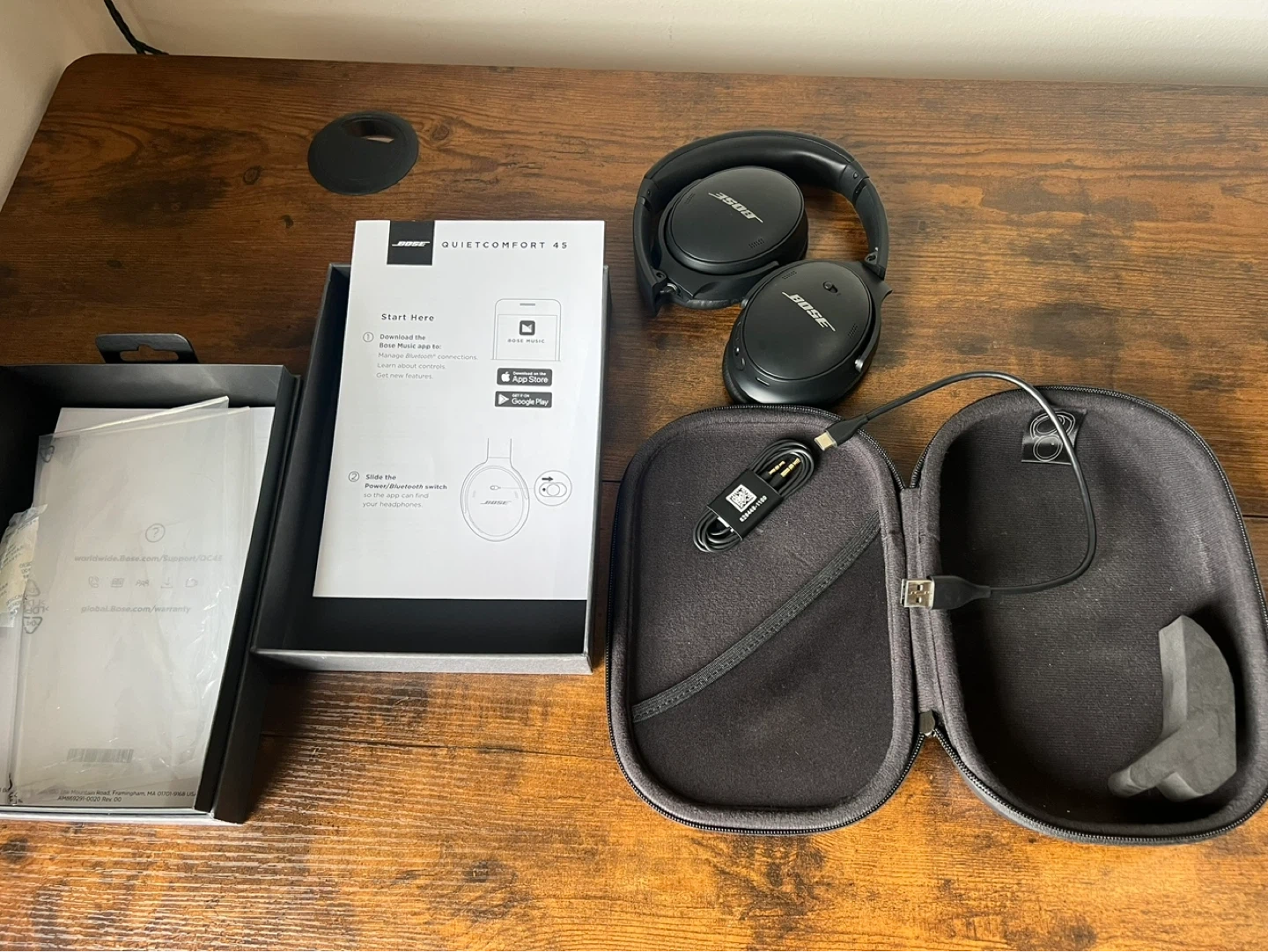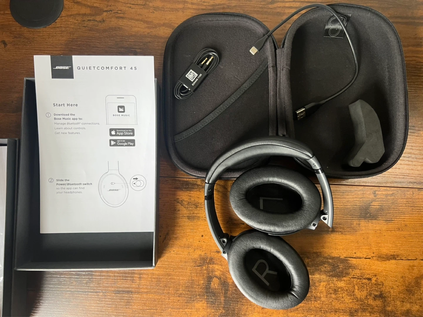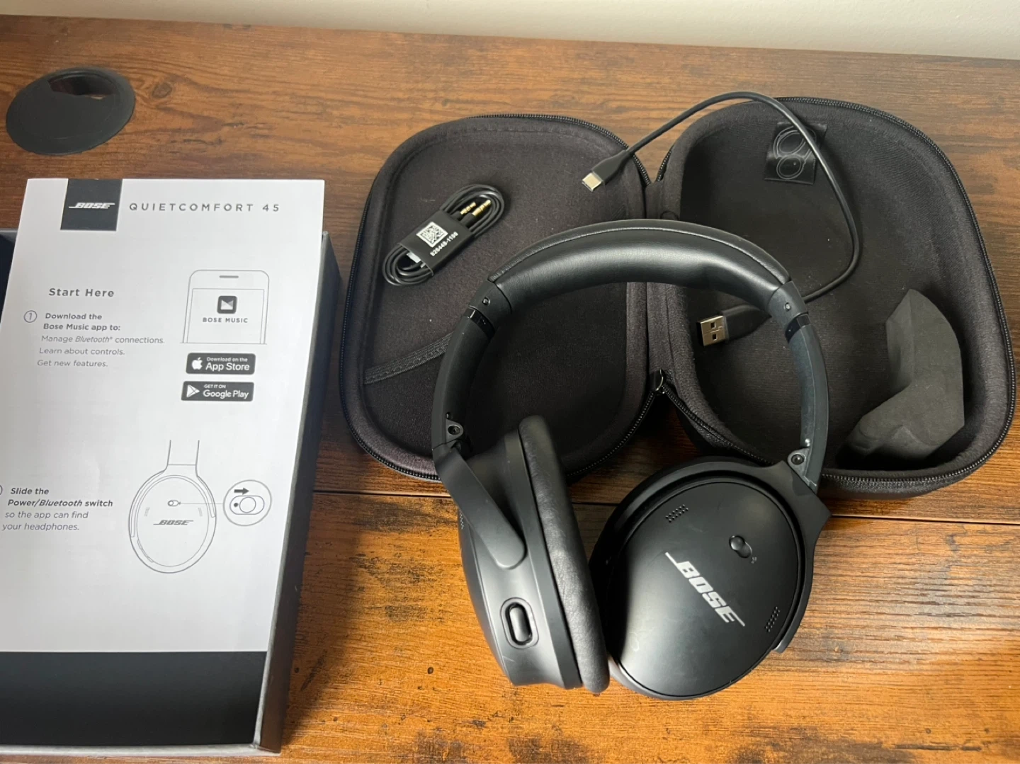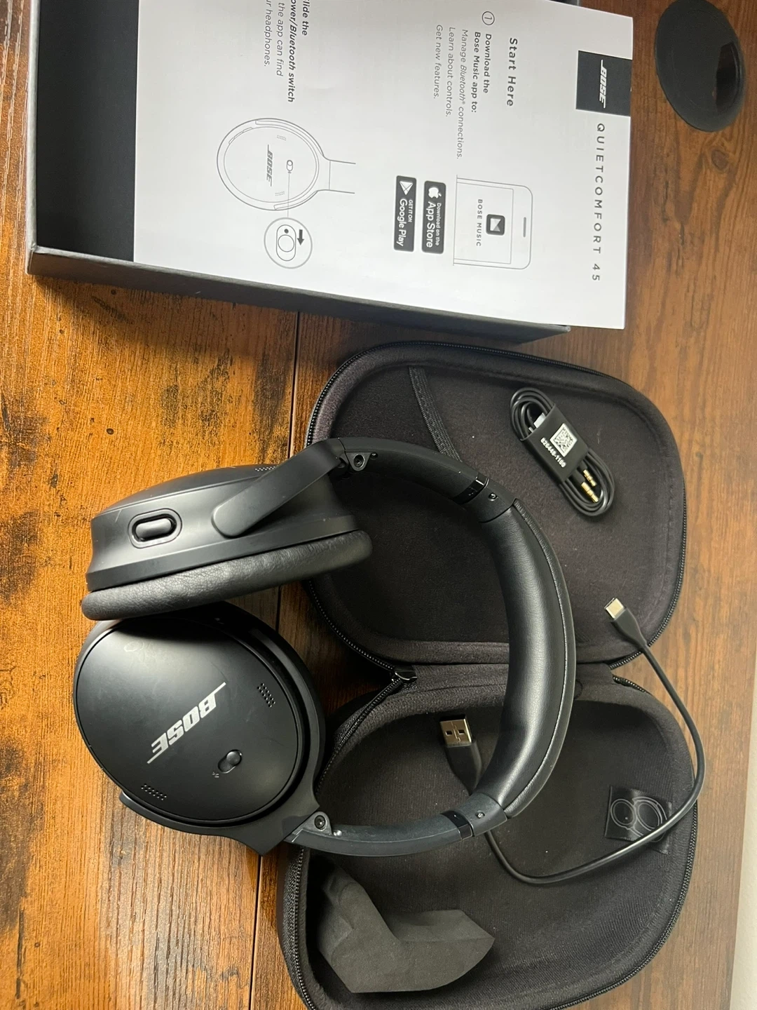 Bose QuietComfort 45 noise-cancelling (QC45) headphones in black. Includes original case, USB-C charging cable, and audio cable. Excellent condition!