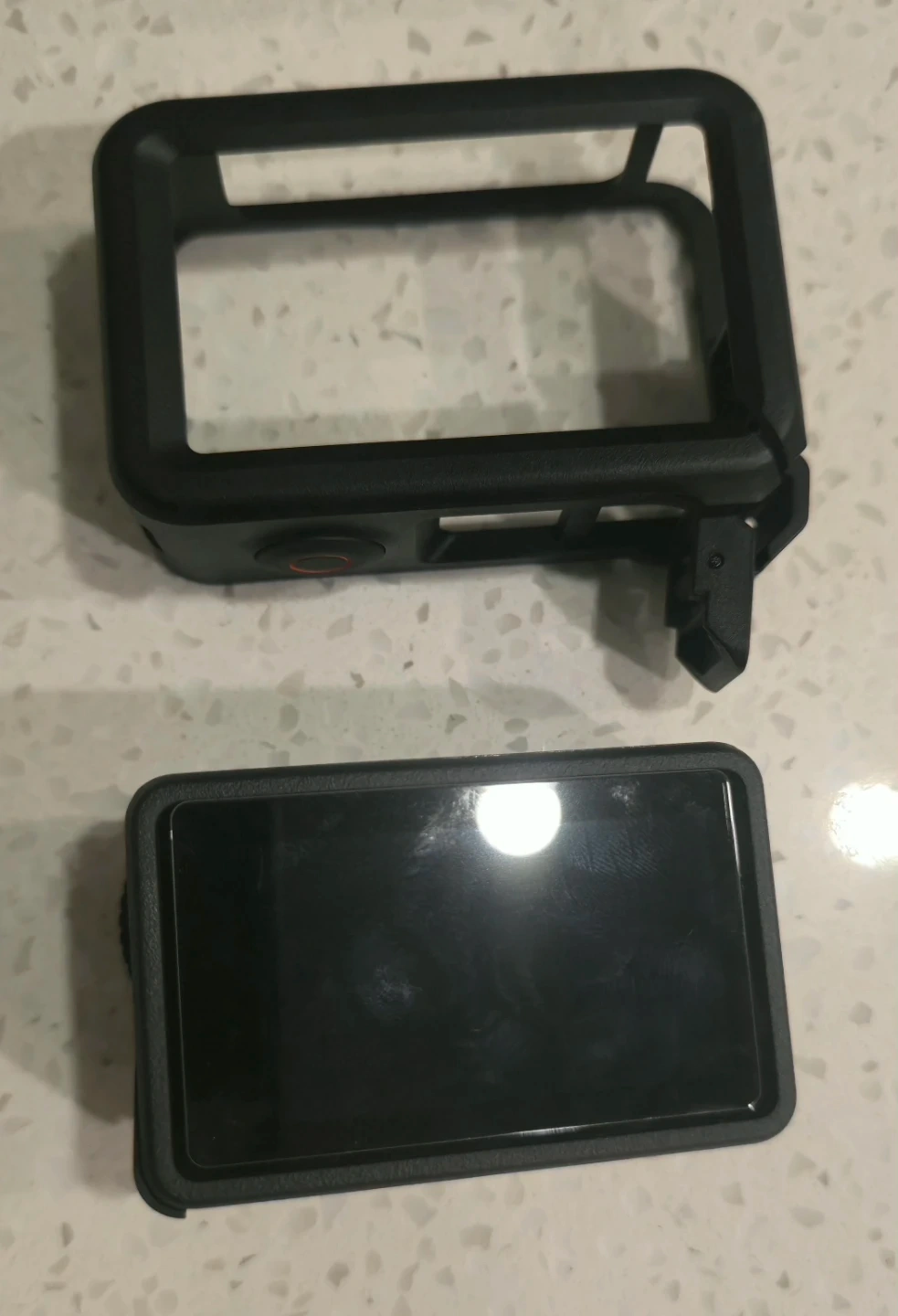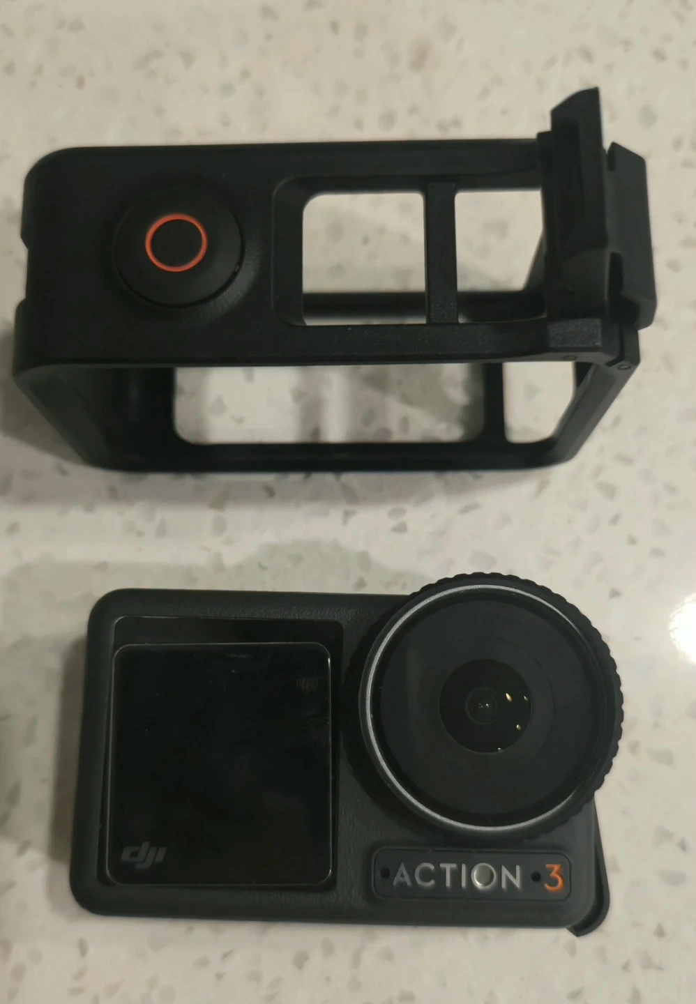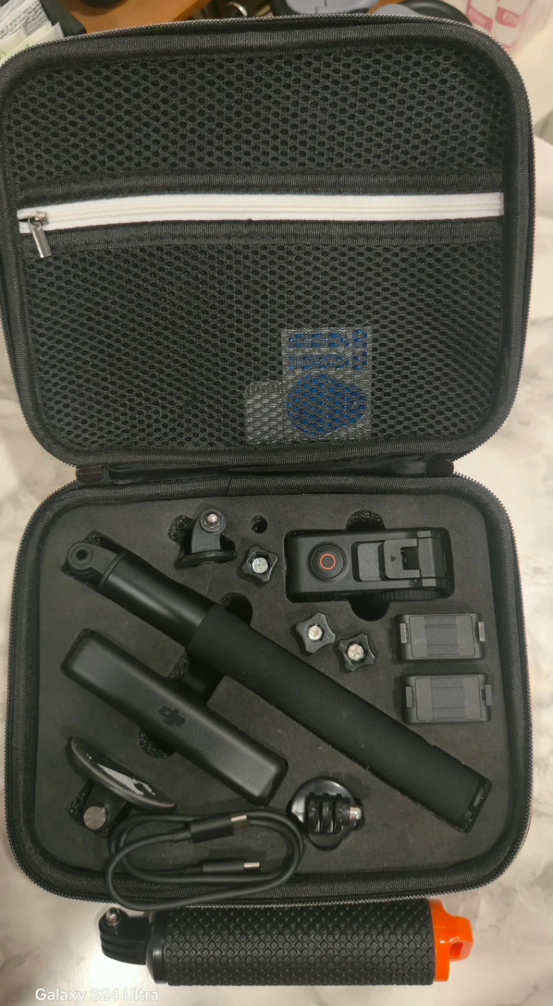 This is the DJI Osmo Action 3 camera with the Adventure Combo package. It includes the camera, a magnetic mounting frame, and various accessories for filming adventures. The combo also comes with a charging handle and extra batteries.
