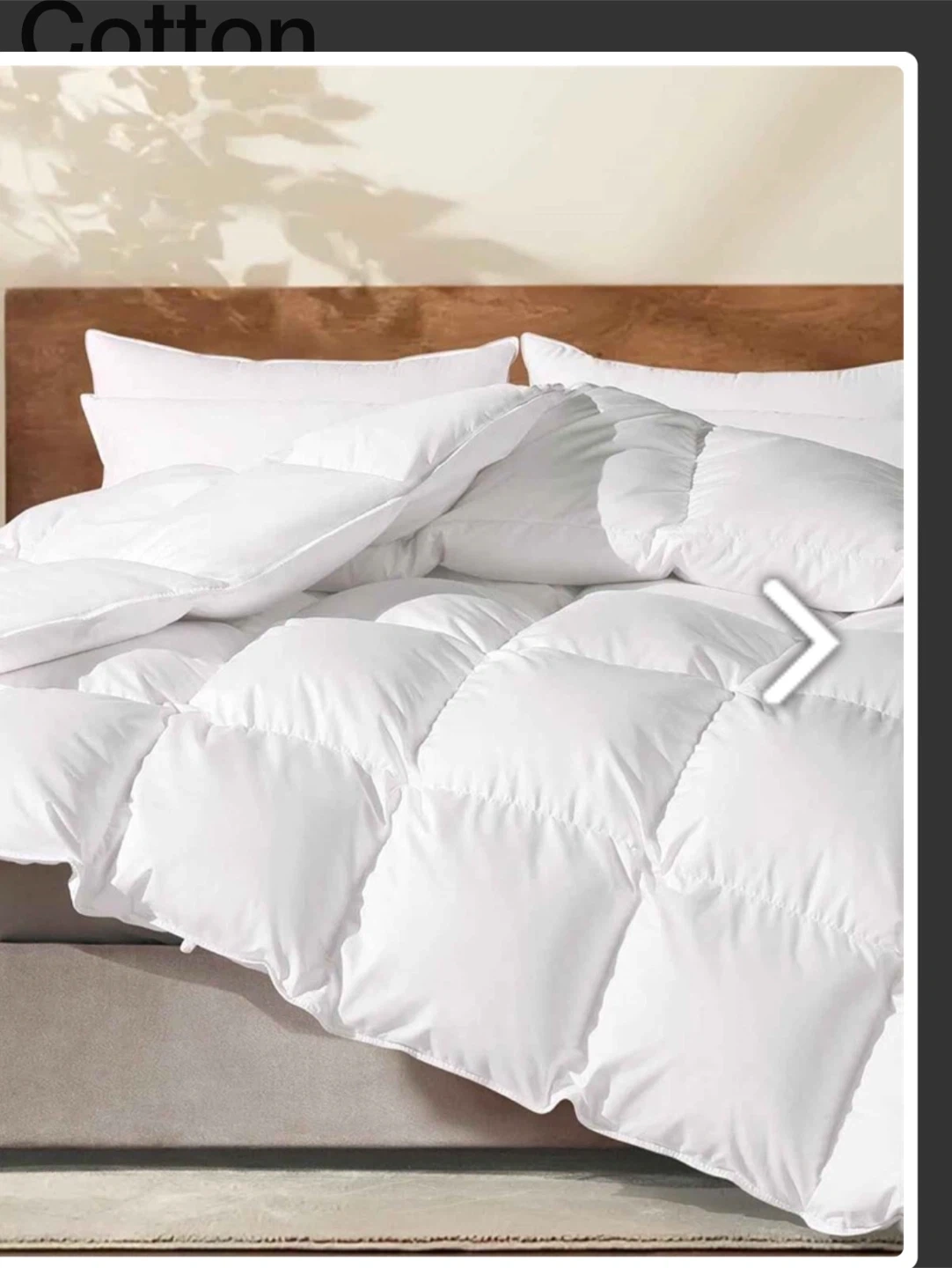 This is a white cotton duvet insert. It's designed with a baffle box construction to keep the fill evenly distributed. It's great for all seasons. Material is 100% cotton.