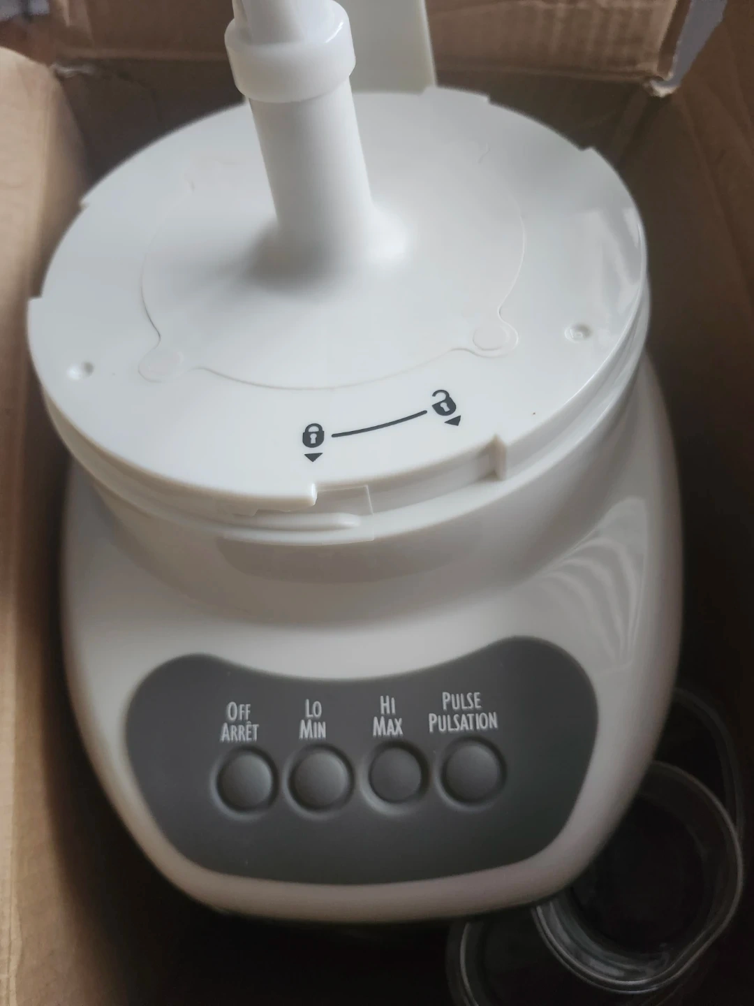 White food processor with 'Off/Arret', 'Lo/Min', 'Hi/Max', and 'Pulse/Pulsation' settings. Unit includes what appear to be extra containers or parts. It has a lock and unlock indicator on the lid. This appliance is useful for chopping and mixing ingredients.open box Not working